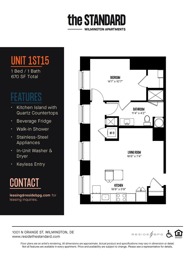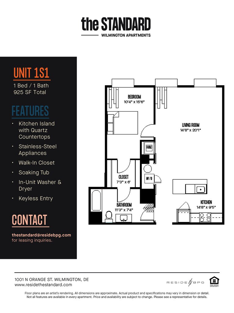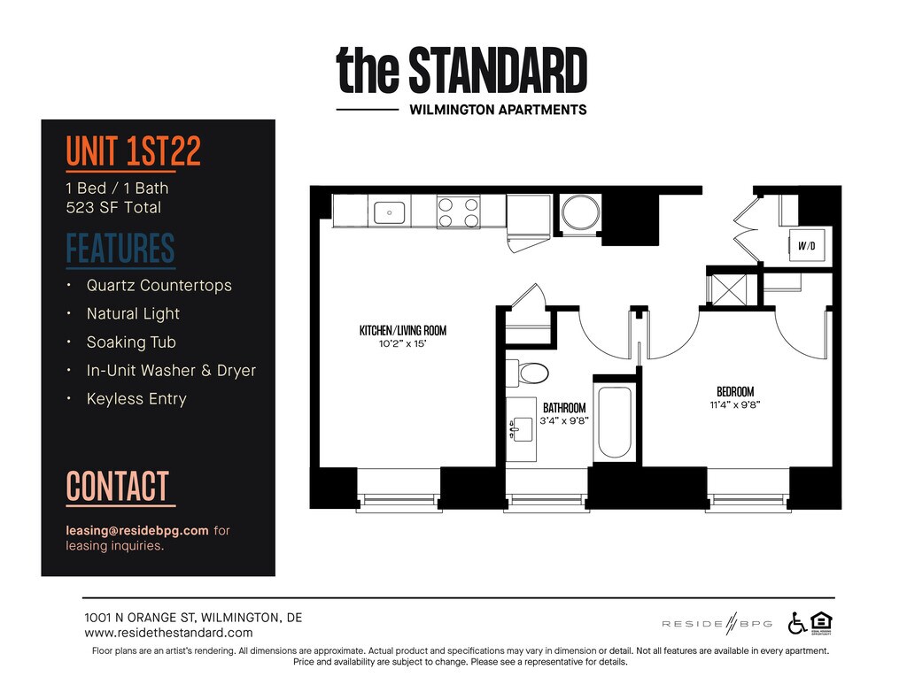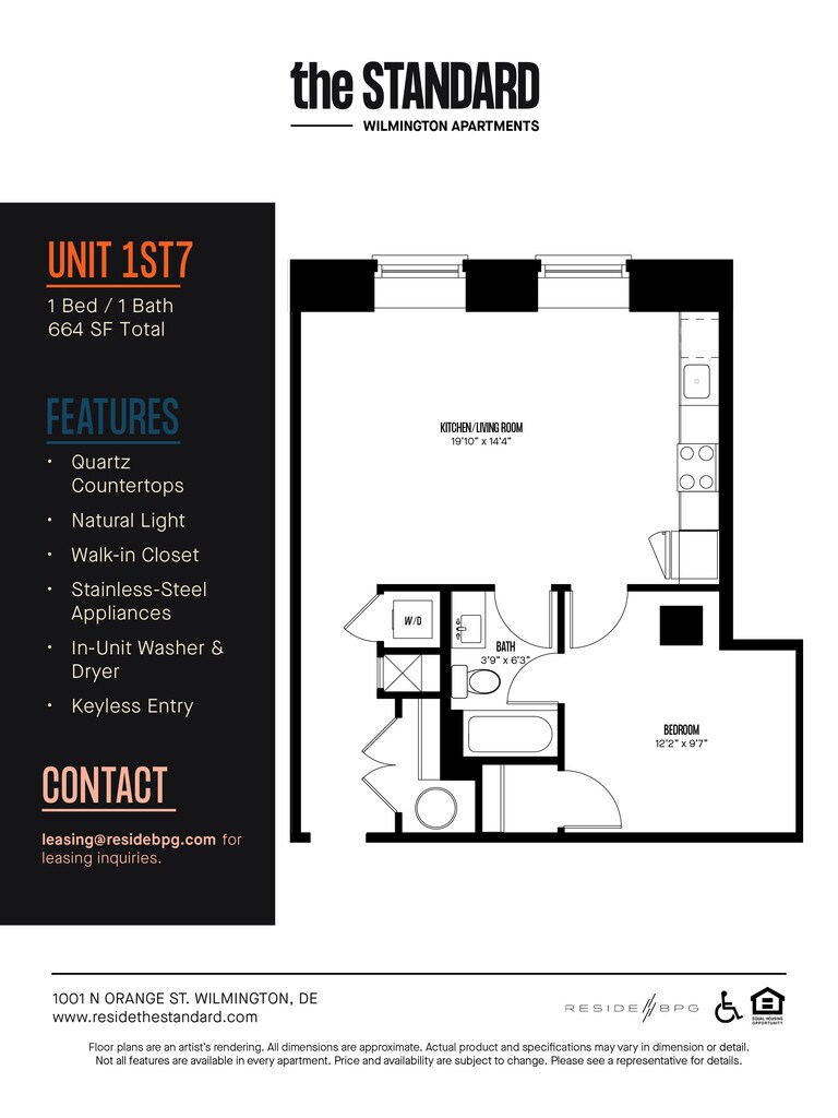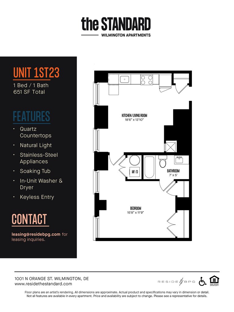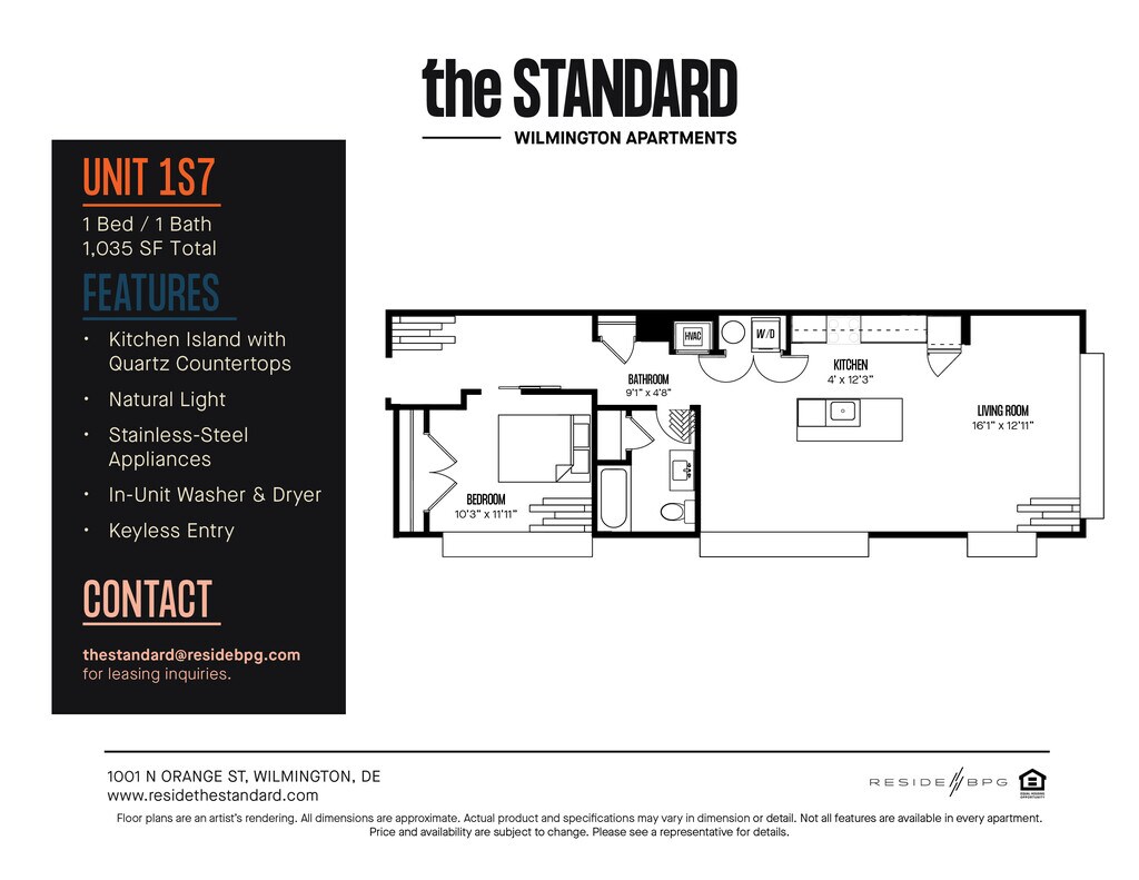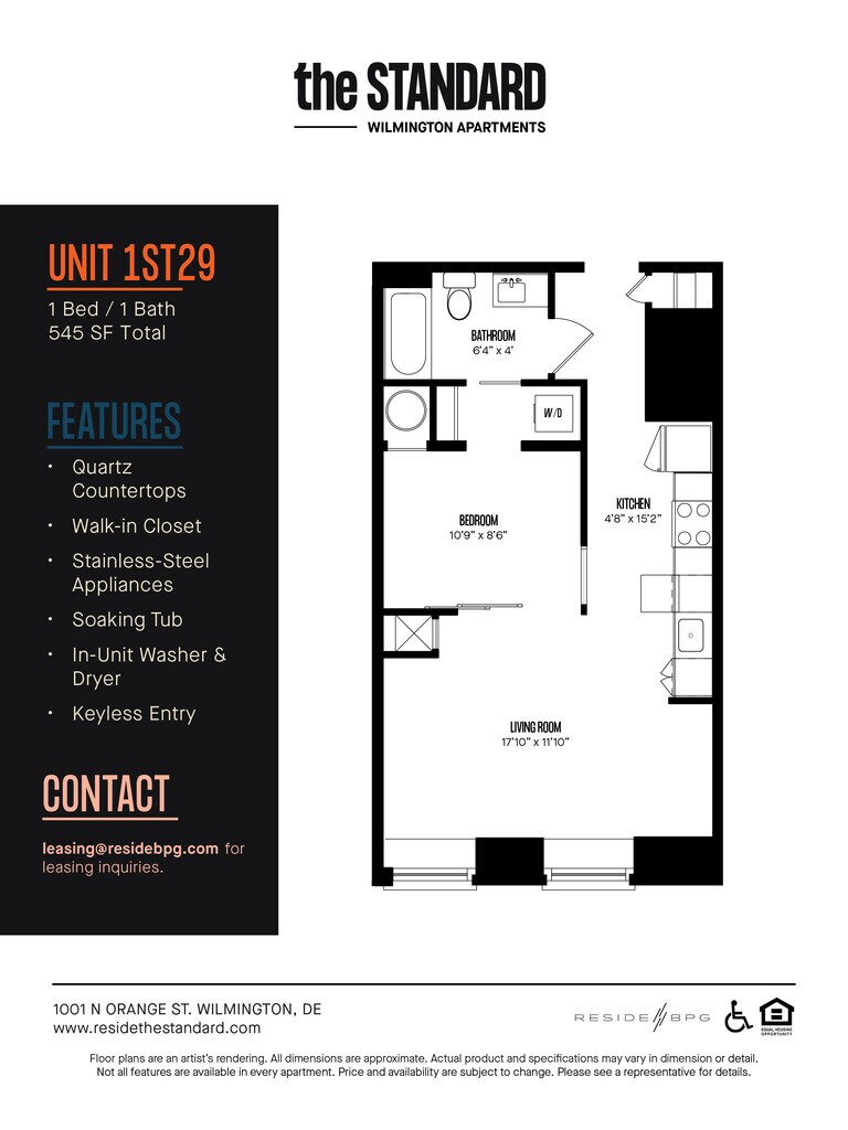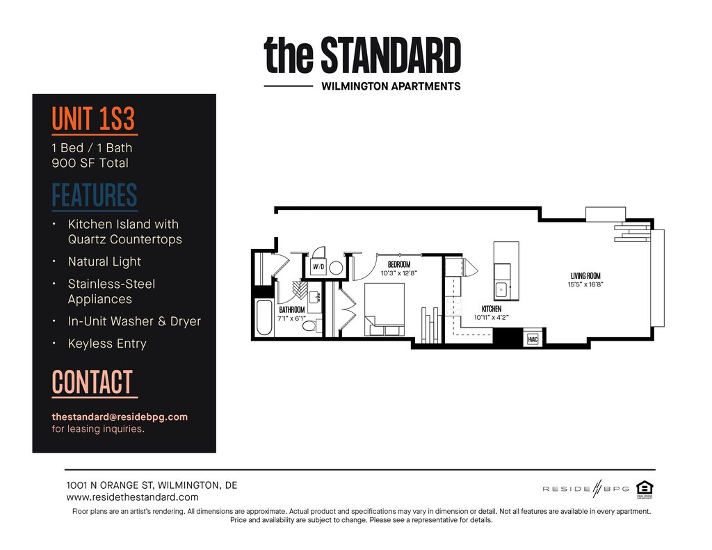 Aptly named The Standard, the new multifamily residential component sets the new standard for apartment living in Wilmington. Residents can take advantage of the various onsite amenities such as a co-working space, boutique fitness center, movie theater, and on-site dining in addition to new amenities like a private rooftop balcony and a resident clubroom perfect for entertaining. The pet-friendly community features a dog-washing station, secure package receiving, 24/7 security, and onsite ResideBPG property management and maintenance. Studio, one-, two-, and three-bedroom apartment homes at The Standard showcases high-end finishes unique to this community like continuous quartz countertops and backsplashes, herringbone tile bathroom flooring, and two-tone upper and lower kitchen cabinets. Other apartment features include kitchen islands and peninsulas, spacious floor plans, stainless-steel appliances, keyless entry, and in-unit washer & dryer.