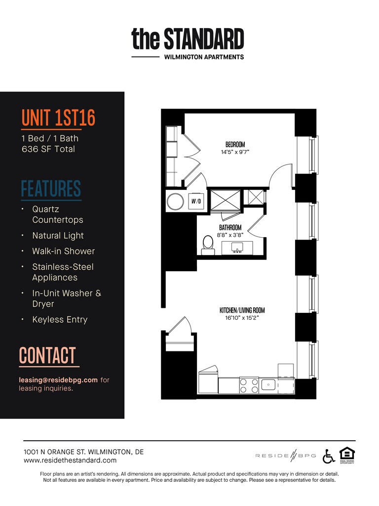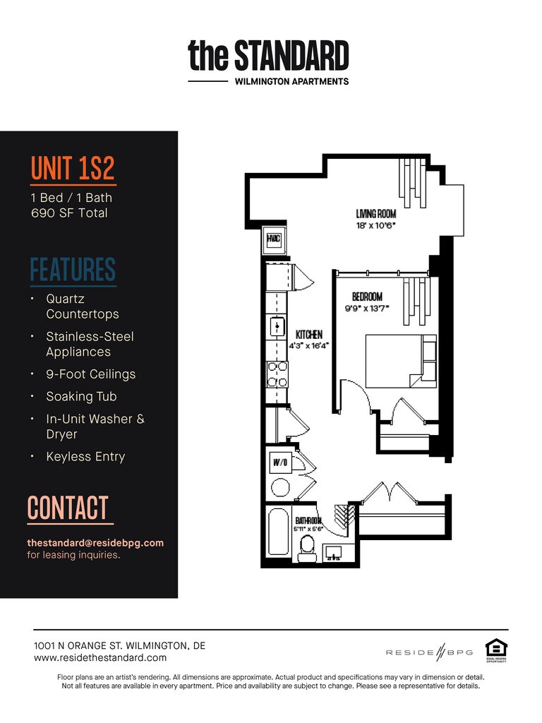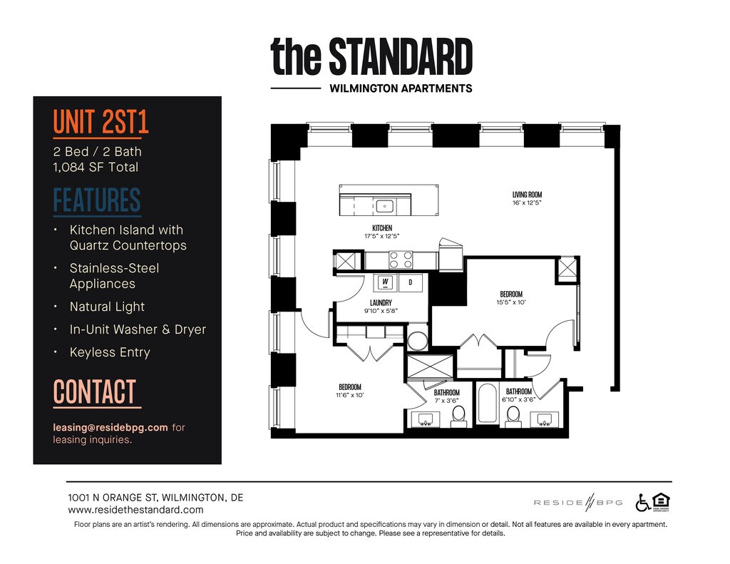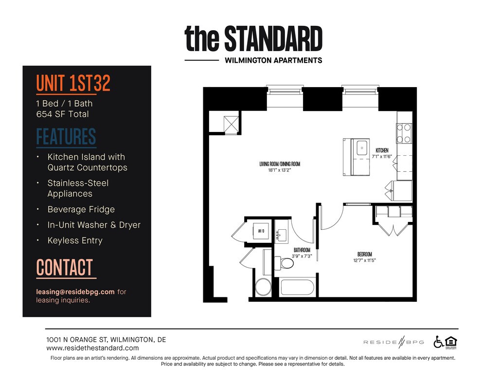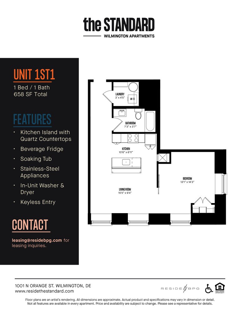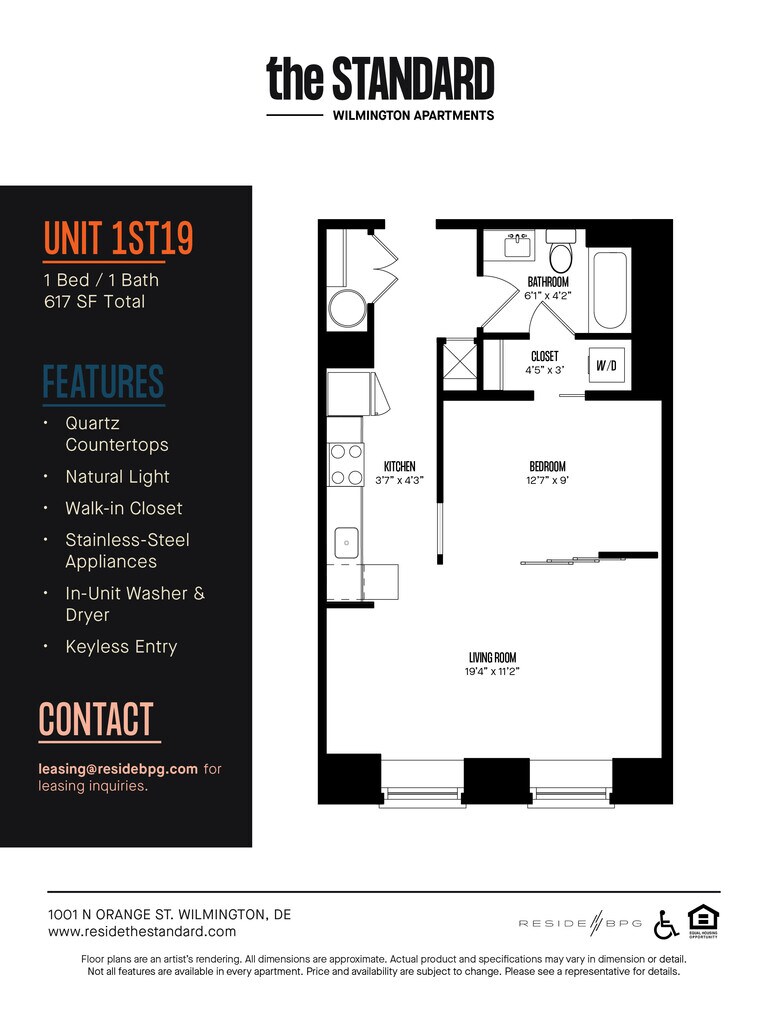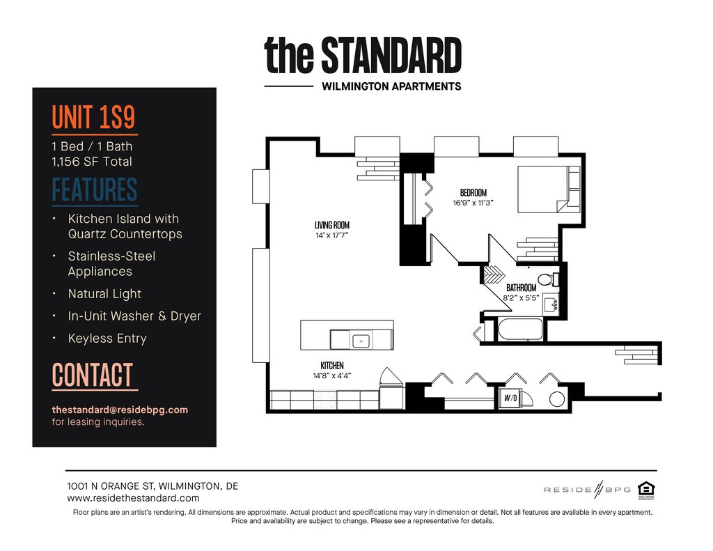 Aptly named The Standard, the new multifamily residential component sets the new standard for apartment living in Wilmington. Residents can take advantage of the various onsite amenities such as a co-working space, boutique fitness center, movie theater, and on-site dining in addition to new amenities like a private rooftop balcony and a resident clubroom perfect for entertaining. The pet-friendly community features a dog-washing station, secure package receiving, 24/7 security, and onsite ResideBPG property management and maintenance. Studio, one-, two-, and three-bedroom apartment homes at The Standard showcases high-end finishes unique to this community like continuous quartz countertops and backsplashes, herringbone tile bathroom flooring, and two-tone upper and lower kitchen cabinets. Other apartment features include kitchen islands and peninsulas, spacious floor plans, stainless-steel appliances, keyless entry, and in-unit washer & dryer.