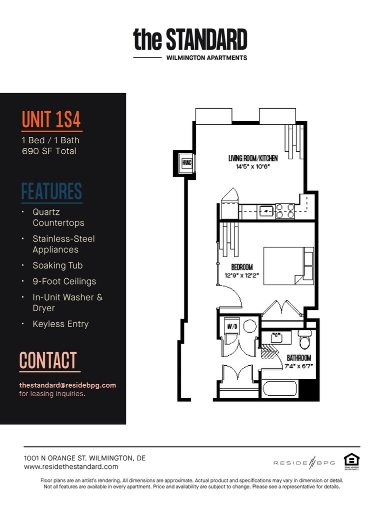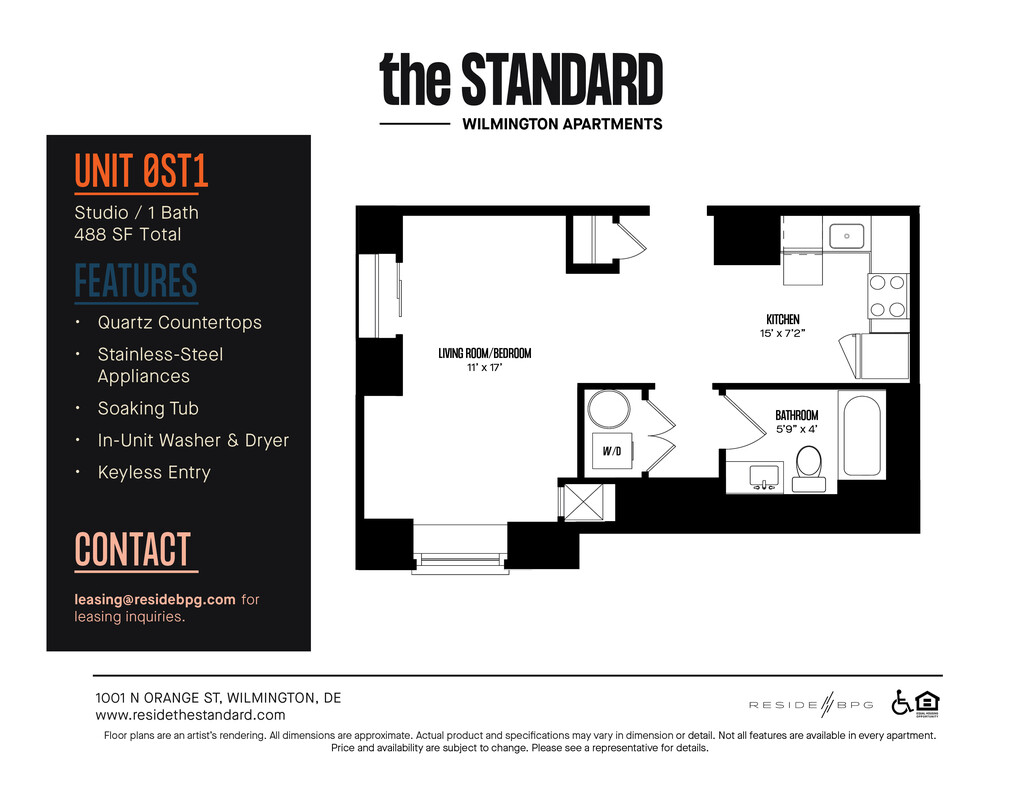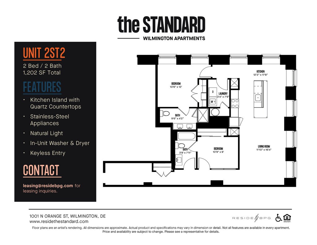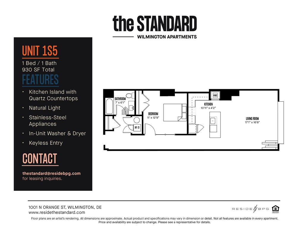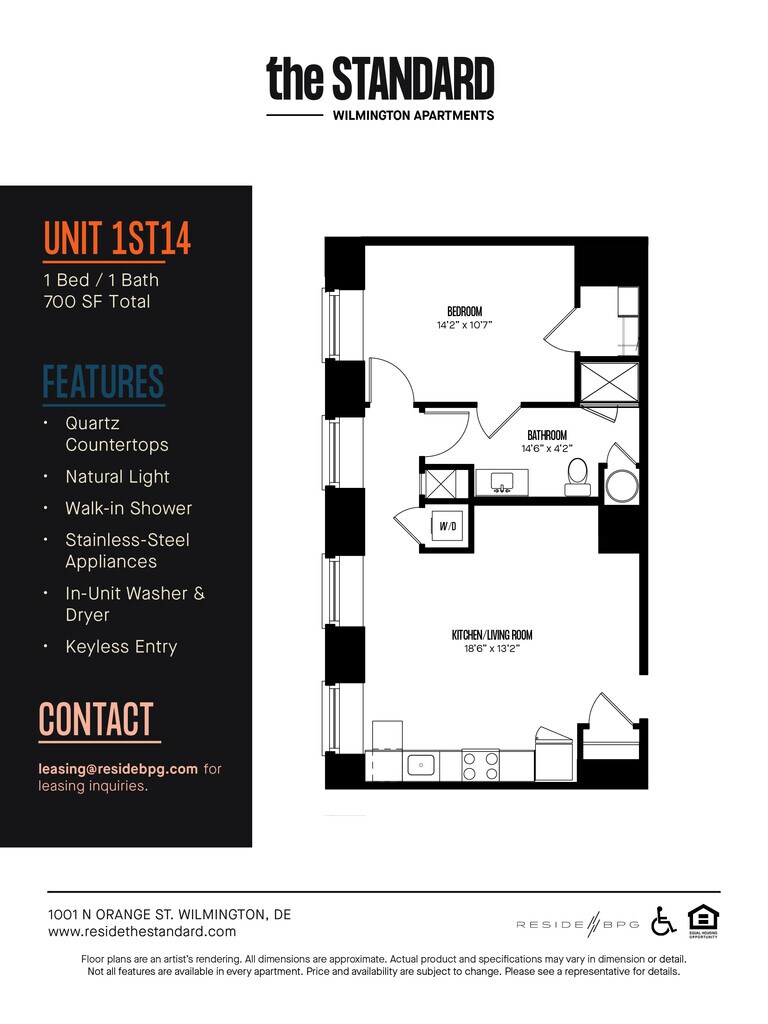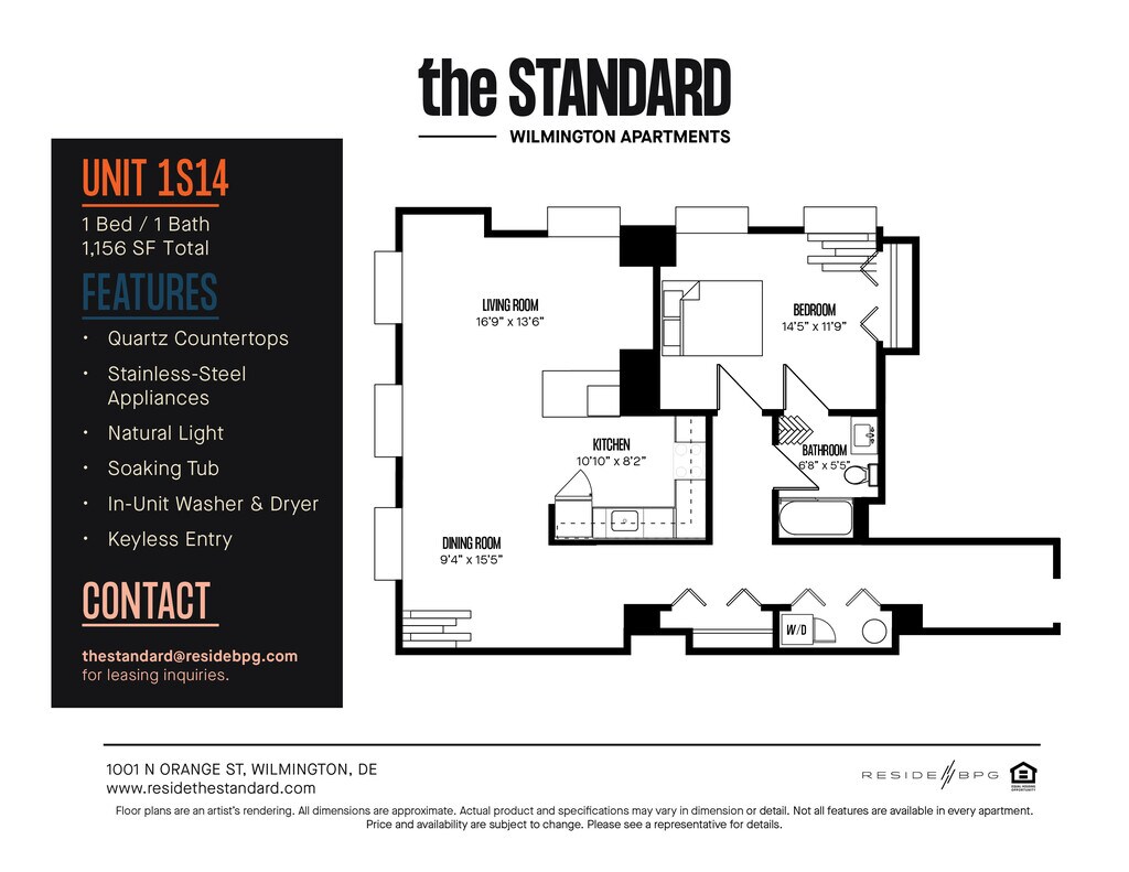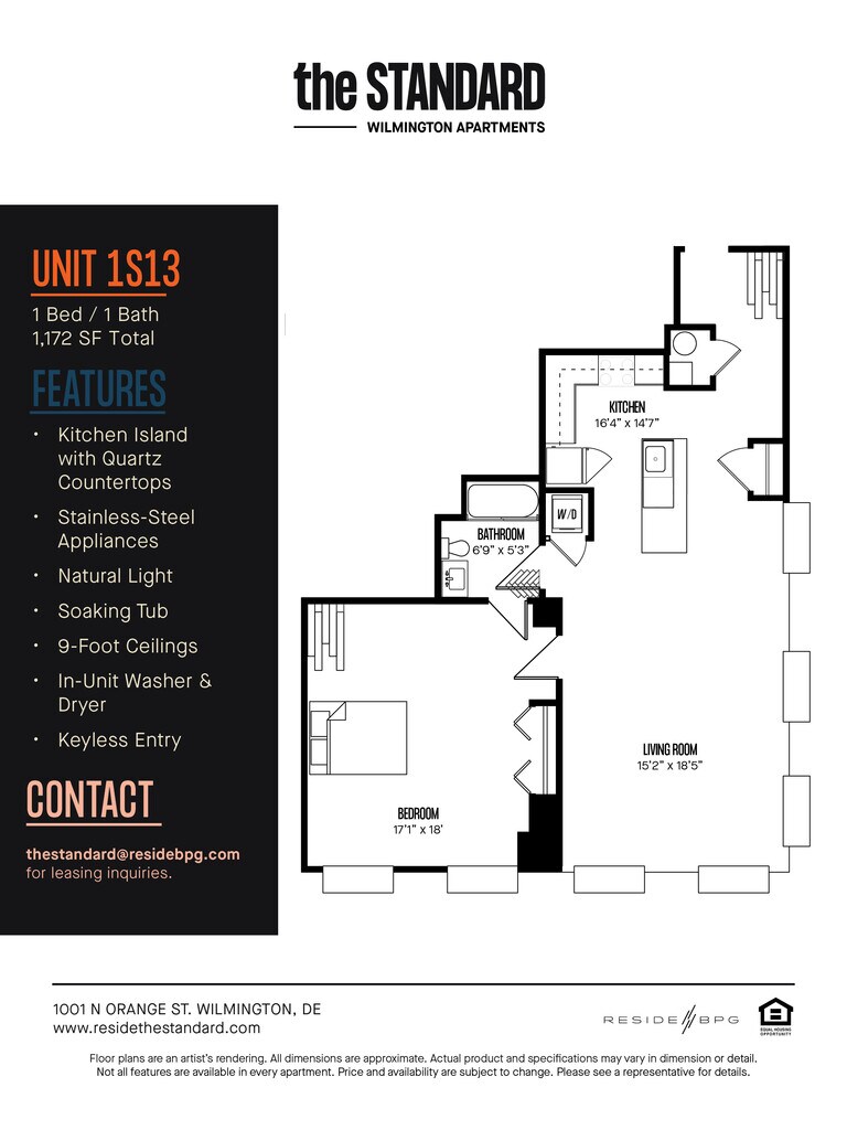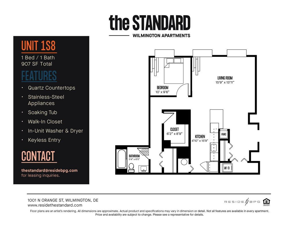 Aptly named The Standard, the new multifamily residential component sets the new standard for apartment living in Wilmington. Residents can take advantage of the various onsite amenities such as a co-working space, boutique fitness center, movie theater, and on-site dining in addition to new amenities like a private rooftop balcony and a resident clubroom perfect for entertaining. The pet-friendly community features a dog-washing station, secure package receiving, 24/7 security, and onsite ResideBPG property management and maintenance. Studio, one-, two-, and three-bedroom apartment homes at The Standard showcases high-end finishes unique to this community like continuous quartz countertops and backsplashes, herringbone tile bathroom flooring, and two-tone upper and lower kitchen cabinets. Other apartment features include kitchen islands and peninsulas, spacious floor plans, stainless-steel appliances, keyless entry, and in-unit washer & dryer.