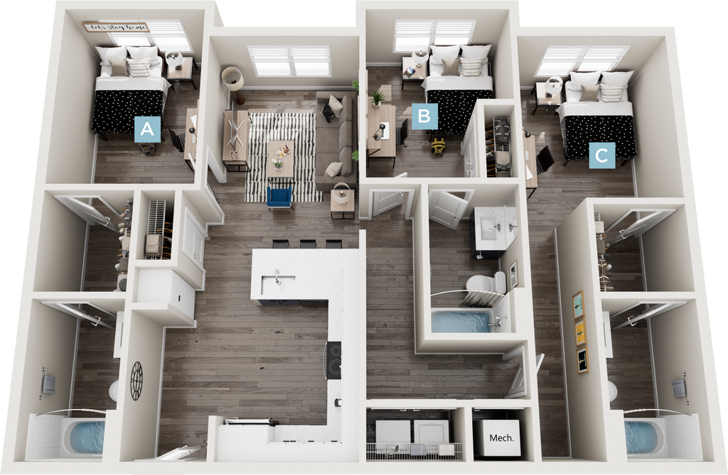 Apartment Model: Cedar I - Workforce - 3x3Call For Rates3 Bedroom, 3 Bath, 1200 sq ftUnavailable![]()