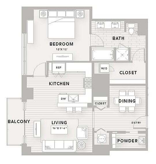 A15 - Floorplan 1 Apartment Unit: 1-604Apartment Model: A151 Bedroom, 1.5 Bath, 1000 sq ftAvailable April 6, 2026Floorplan A1