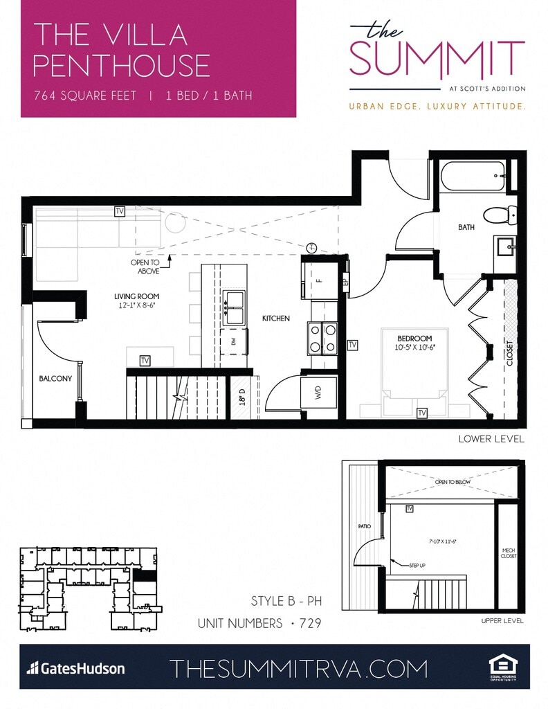 The Villa - Style B Penthouse - Floorplan 3 Apartment Unit: 733Apartment Model: The Villa - Style B Penthouse$2,1201 Bedroom, 1 Bath, 718 sq ftAvailable November 23, 2025The Retreat