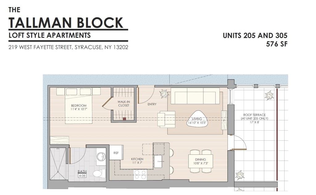 ***Please Call or Email For Availability*** Welcome to The Tallman Block in the heart of Historic Armory Square! Located above "The Hops Spot", the property contains 16 one-bedroom/one-bath apartments completed in 2018. All units have window views and share a large outdoor roof top court yard. Four units have private roof top terraces. All units have granite countertops with bar seating and stainless steel appliances in their kitchens, walk-in bedroom closets, and large bathrooms with custom tiled showers. The property is served with high-speed internet over a secured mesh-network which is included in the rents. Secured key-fab access for tenants is available both from the building’s new West Fayette Street elevator lobby and from Walton Street; with secured phone access for guest available at West Fayette Street entrance only. All public areas are monitored by security cameras and there is a laundry room on each building level. Parking is available in the Atrium garage directly across from the buildings main entrance at $110 per month (parking fee subject to change by garage owner). The Tallman Block is pet friendly with one dog or cat (30 lb. max) allowed per unit provided a $250 pet security deposit and a $25 per month pet fee.