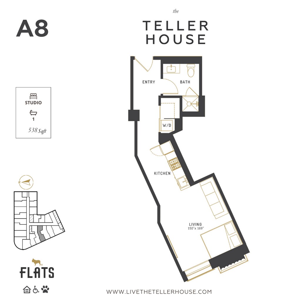 The Teller House offers Studio to 1 Bedroom apartments starting from $1,260 and having 313–671 sq ft. Here is the current pricing and availability: