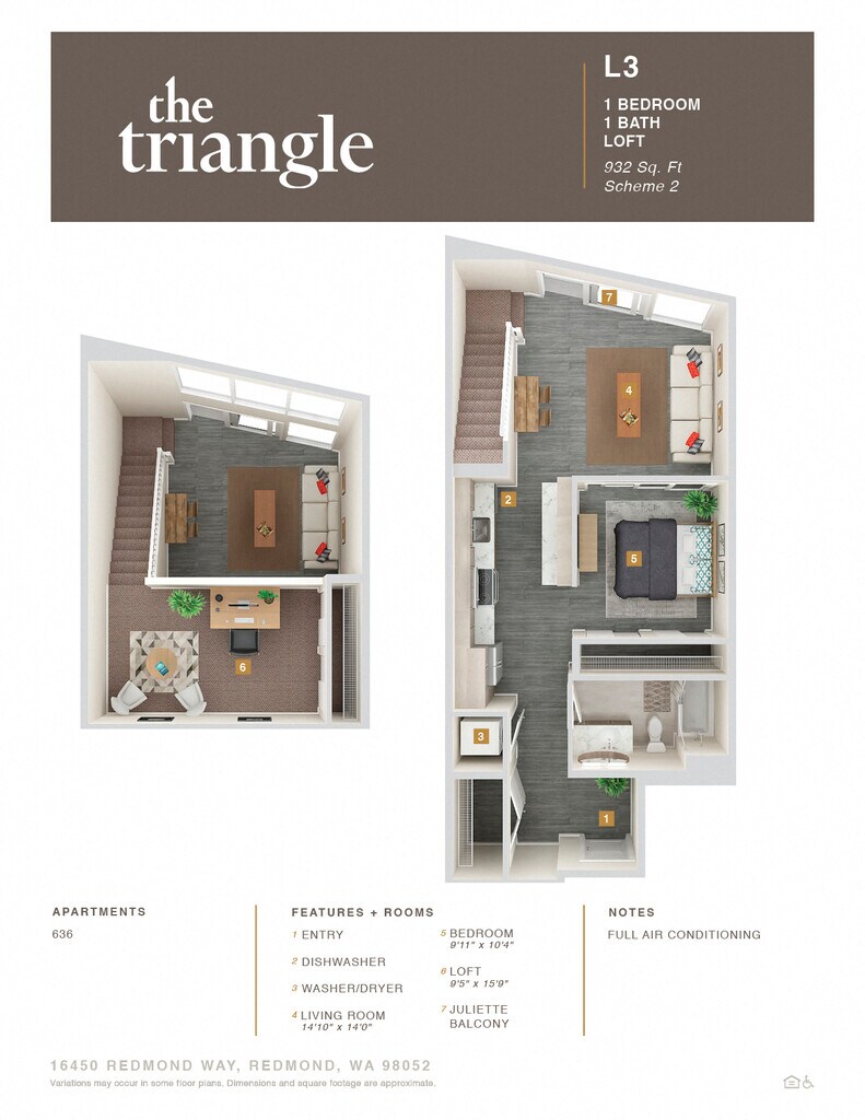 L3 - Floorplan 1 Apartment Unit: 636Apartment Model: L3$3,7661 Bedroom, 1 Bath, 932 sq ftAvailable NowFloorplan L6
