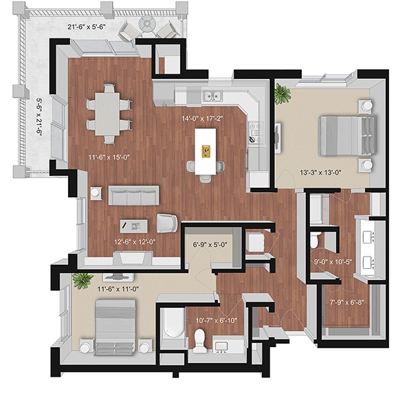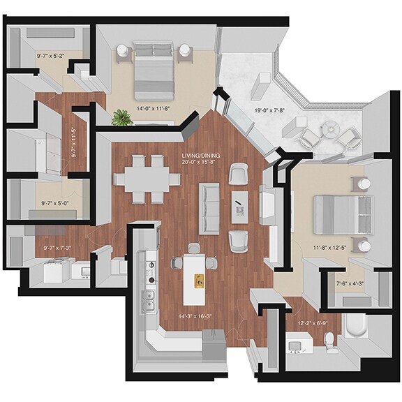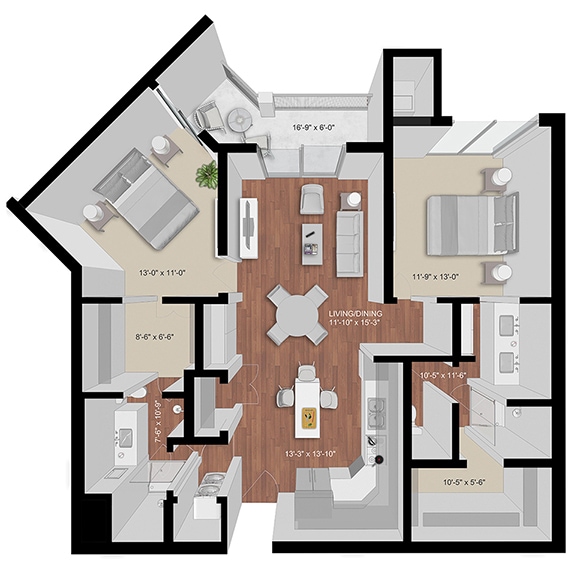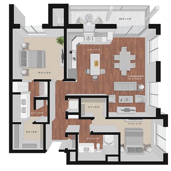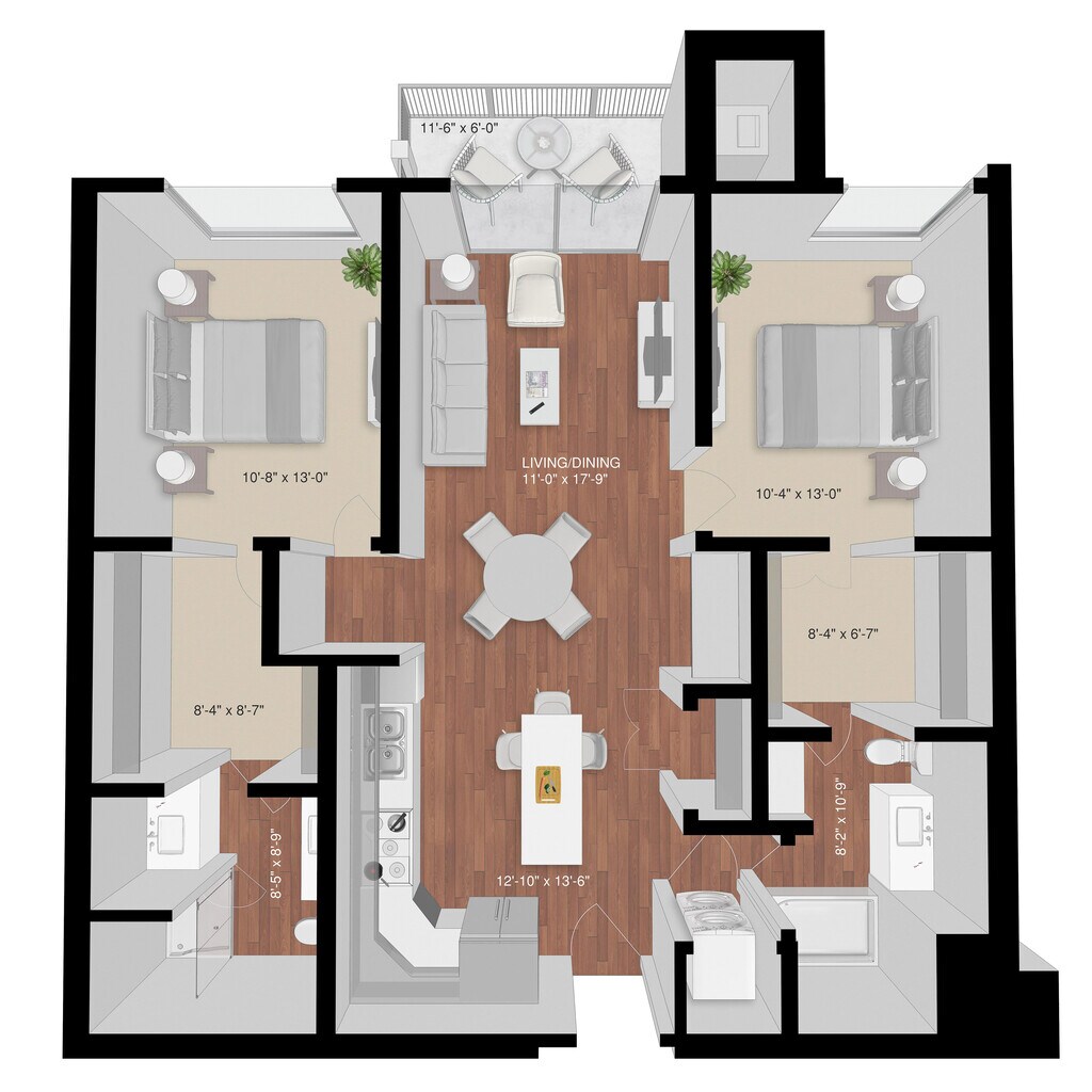 1 Bed, 1 Bath, 733 sq ftPlus FeesAvailable NowModel Gallery