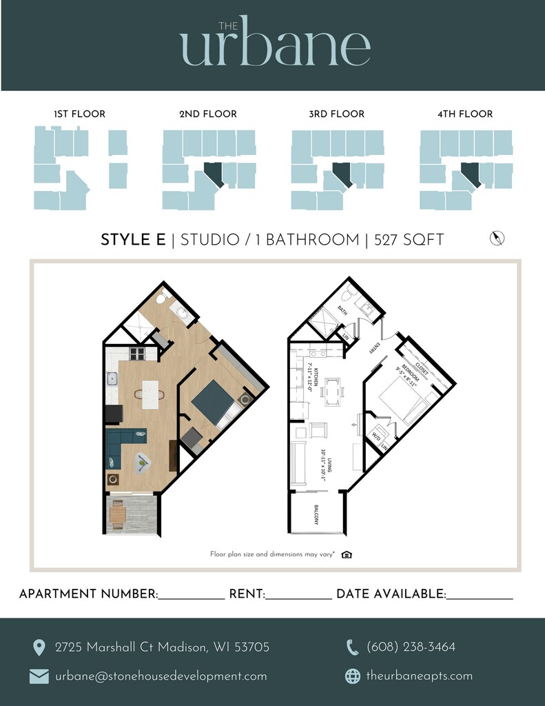 E-Style - Floorplan Apartment Unit: 307Apartment Model: Studio, 1 bath$1,725Studio, 1 Bath, 527 sq ftAvailable August 1, 2026C-Style