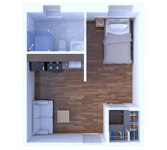 Apartment Unit: 0110Apartment Model: Studio Floor Plan S7BCall For RatesStudio, 1 Bath, 232 sq ftAvailable NowStudio Floor Plan S2