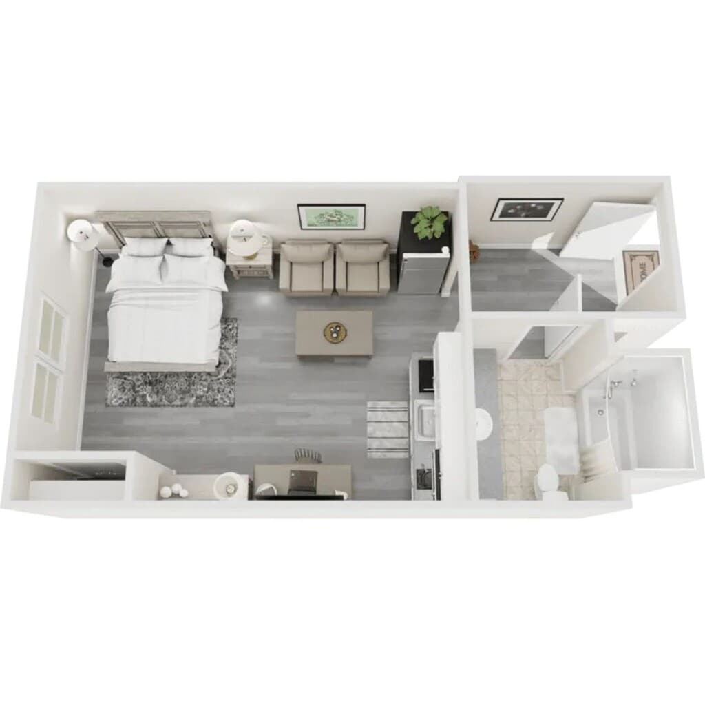 Apartment Model: 1 Bedroom King Sofa – KS1 Bedroom, 1 Bath, 460-490 sq ftAvailable NowFloorplansPhotos![]()