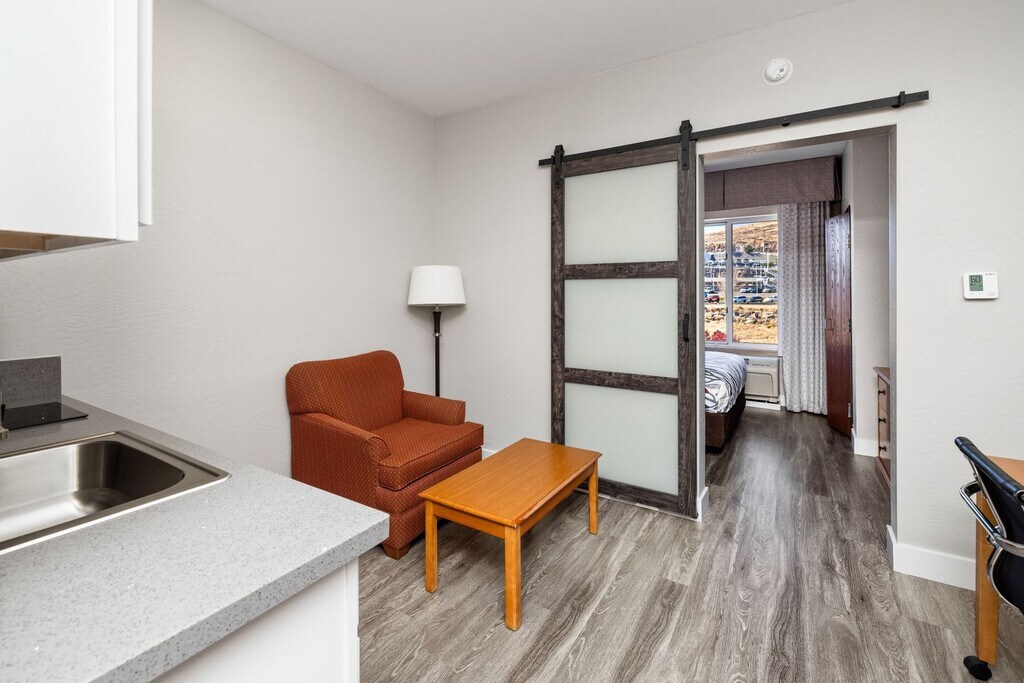 This 420 square foot studio layout features a queen bed with two chairs, a stainless steel kitchenette, quartz countertops, and modern wood-style flooring. Enjoy included Wi-Fi, DirecTV with HBO, and all utilities covered for worry-free living.