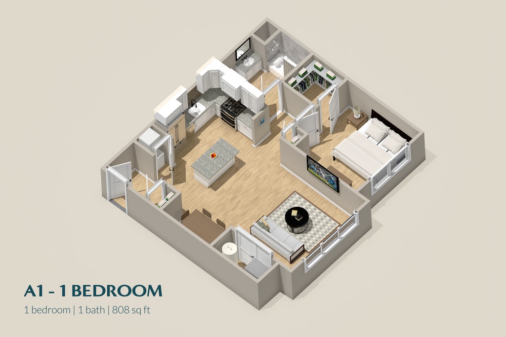 Apartment Model: A1From $2,2001 Bedroom, 1 Bath, 808 sq ftAvailable Now![]()