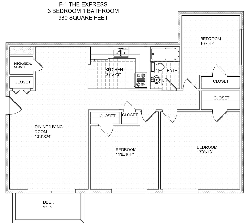 - 3 Bedrooms- The Express- $1,3253 Beds, 1 Bath, 980 sq ftAvailable Dec 31- Model Gallery- Floorplans- Availability Details- Price - Availability Date - Unit - Sq Ft - View Details - $1,325 - December 31, 2025 - 2506A - 980 - $1,325 - December 31, 2025 - 2512A - 980 - $1,325 - December 31, 2025 - 2536L - 980 - Model Amenities and Features- Features- High Speed Internet Access