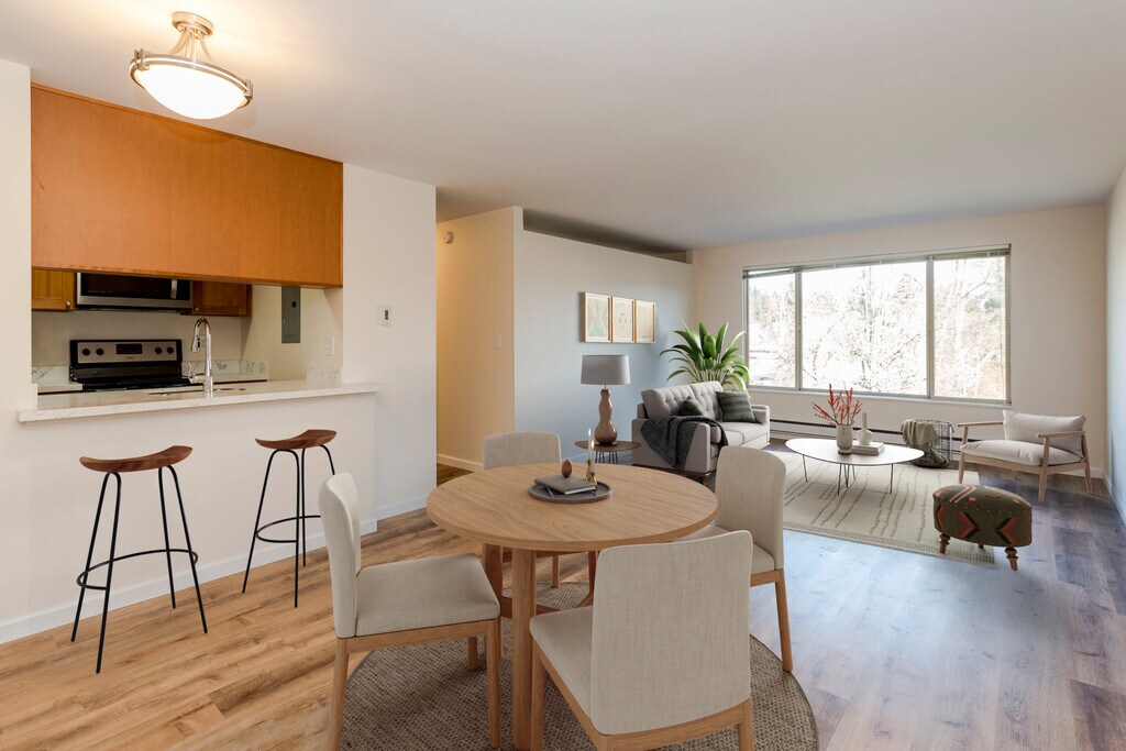The Villager Apartments, is located in the up-and-coming Lake City where you will find restaurants, cafes and even a few brew houses. The public library, the Thursday farmer's market and a city park are next door. Yoga, Crossfit and a gymnastics academy are minutes away by foot. The Safeway grocery store is a two-minute drive away and a Bartells drug store a three-minute walk away. Schools and the Meadowbrook public pool are just over a mile away. The University of Washington is an easy drive away, less than 15 minutes, and downtown Seattle is a straight shot down the freeway. Everything you need is within easy reach! The bus stops at your door. There is an outdoor parking lot for your car, for a small fee, and the option to upgrade to covered parking. But all key amenities are within walking distance.