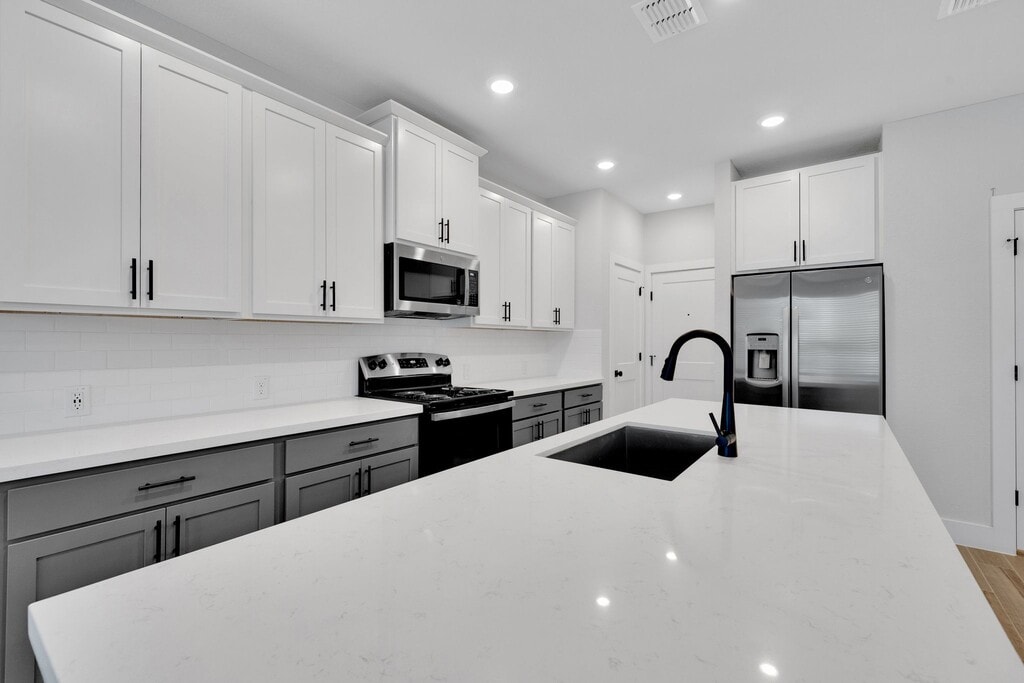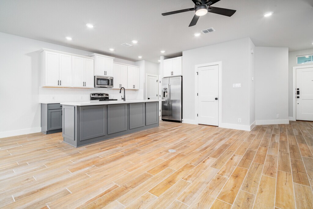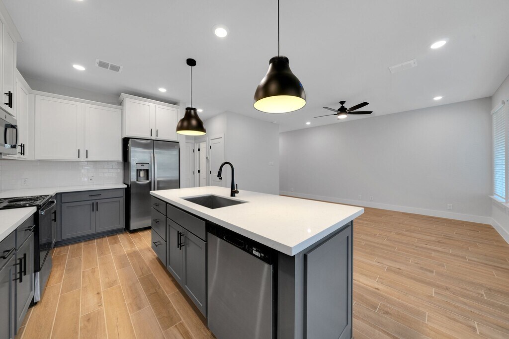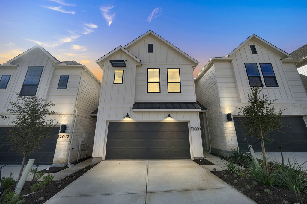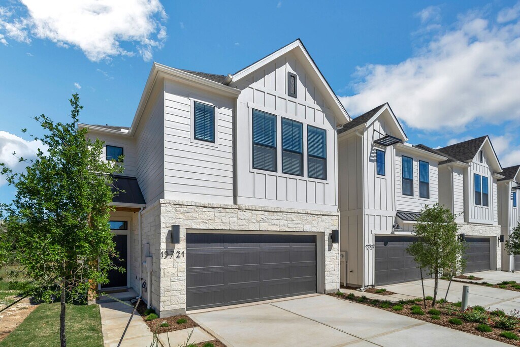 Immerse yourself in modern comfort within our premier community, where the balance of nature and urban living awaits. Enjoy leisurely walks along picturesque trails and dedicated pet areas. Benefit from the convenience of privately fenced yards with included lawn care, ensuring your outdoor space remains pristine with ease. Situated near major highways, shopping centers, and newly built HEB, our community offers easy access to essential conveniences. Our farmhouse-style residences boast a timeless aesthetic, incorporating a black and white aesthetic with a sophisticated charm of black windows, barn lights, standing seam metal roofs and contemporary metal awnings. Experience the warmth of cedar wood beams and posts contrasted against the soft white exterior stone, adding a rustic yet refined touch to your surroundings. Stepping inside, the kitchen boasts two-toned shaker-style cabinets, quartz countertops, a counter-depth refrigerator, single-bowl sink, ample pantry and storage, pendant lighting and matte black hardware that enhance your living experience. Interior features tile flooring, ceiling fans, six inch baseboards, wood blinds, and industrial design matte black plumbing fixtures with luxe-style shower enclosures. Attention to detail is evident at every corner. Whether you work from home or need a quiet spot, every residence features an individual workspace. Keyless entry and a two-car garage further enhance the convenience and functionality of the residence. Pets are welcome. Premium Lots Available. Explore modern living in our exquisite community, where every detail is crafted to enhance your lifestyle. Book your own self-guided tour by clicking the link to our property website found on the contact tab!