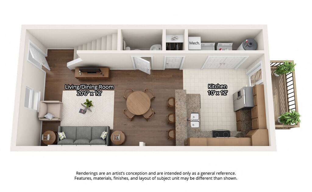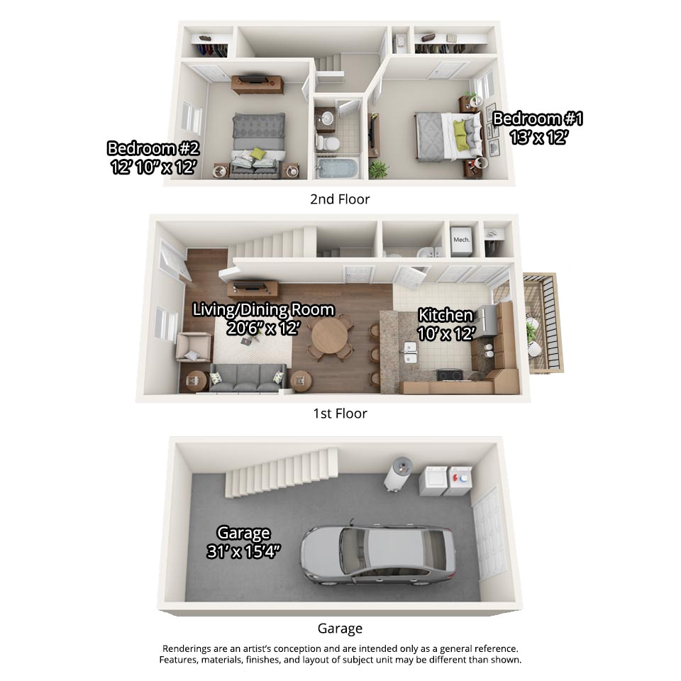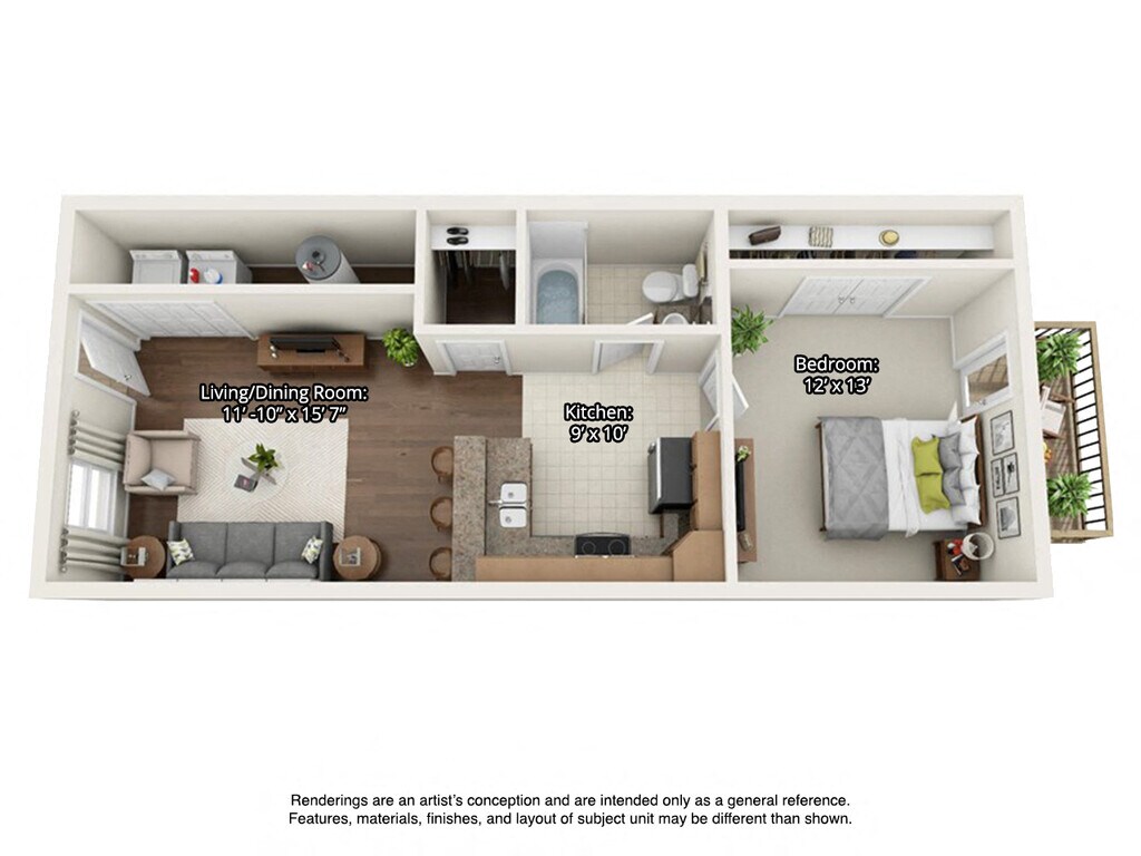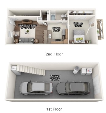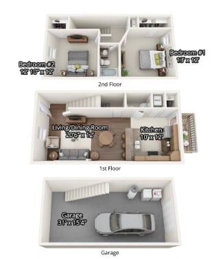 Apartment Model: 1 Bedroom Townhome with Drive Under GarageFrom $1,1791 Bedroom, 1 Bath, 640 sq ftAvailable Now![]()