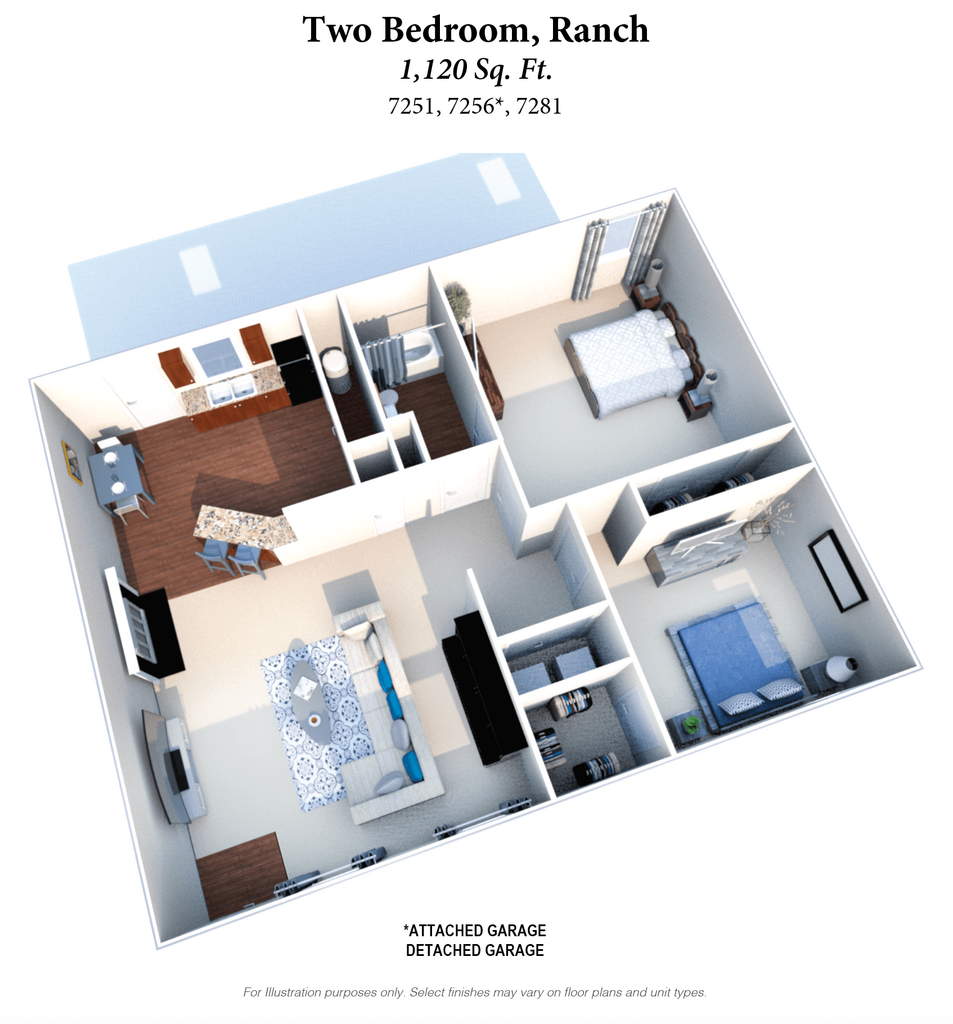 Apartment Model: 2B, 1B - Ranch - 7420, 7422, 7451, 7471, 7491, ...2 Bedroom, 1 Bath, 985 sq ftAvailable November 14, 2025![]()