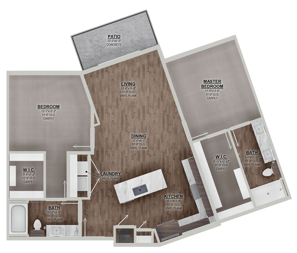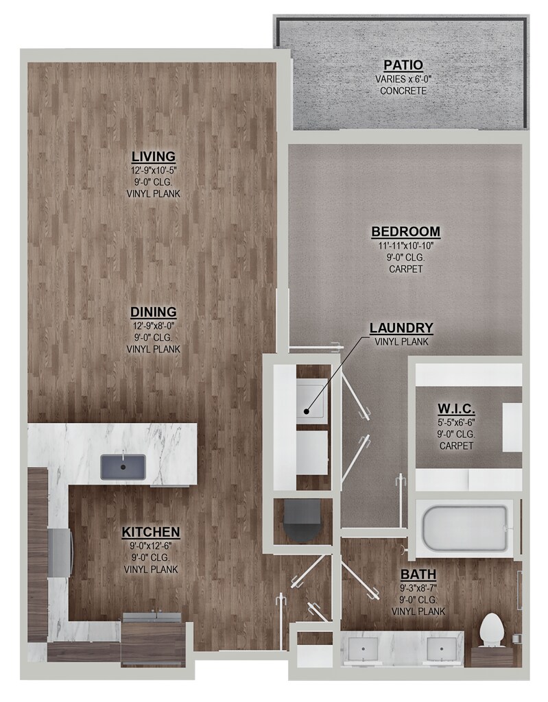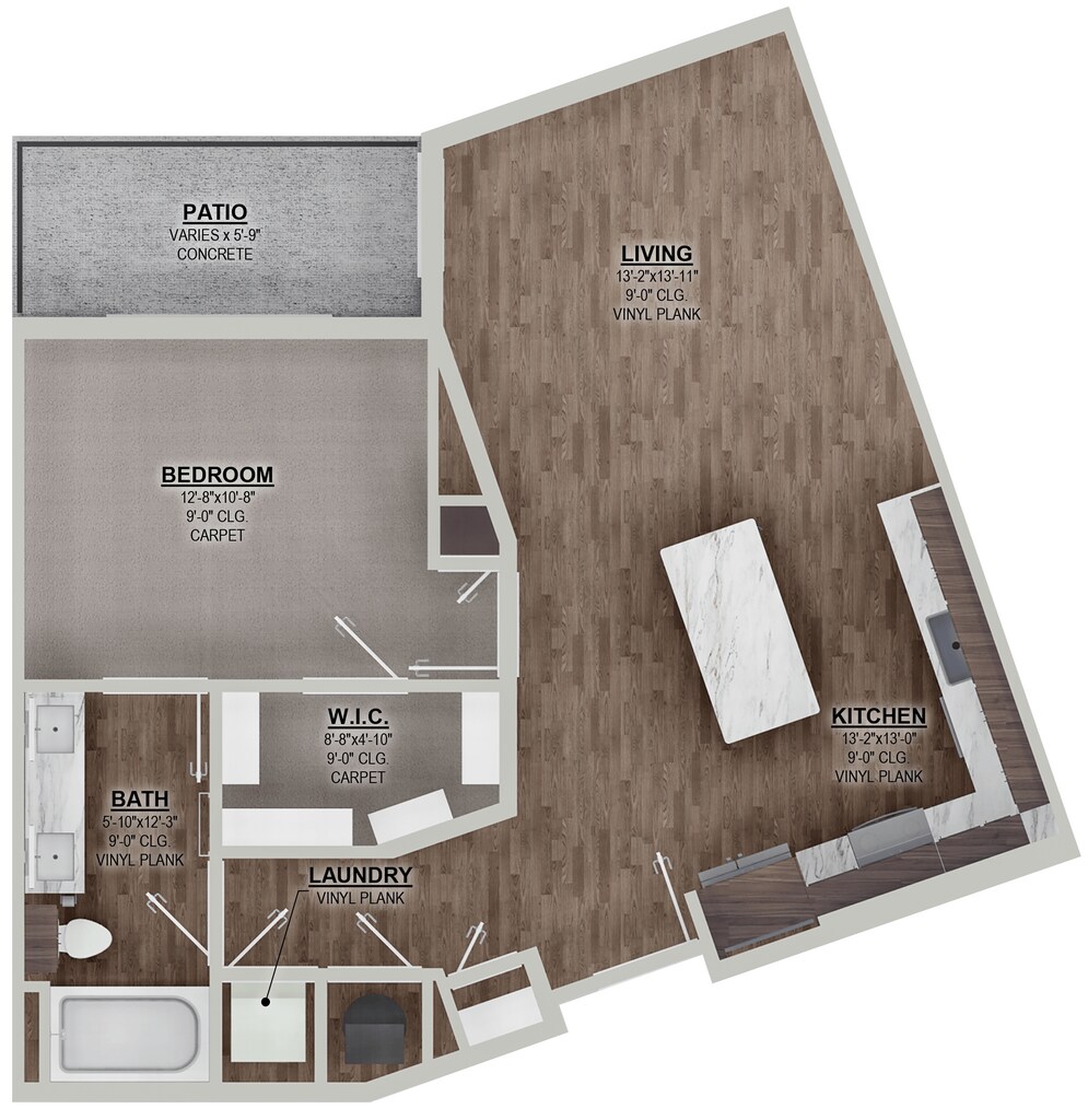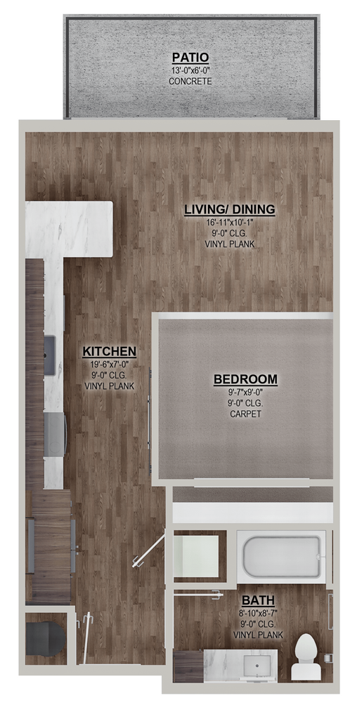 E1 - Floorplan 2 Apartment Unit: 409Apartment Model: E1$1,262Studio, 1 Bath, 568 sq ftAvailable December 12, 20251 Bedroom