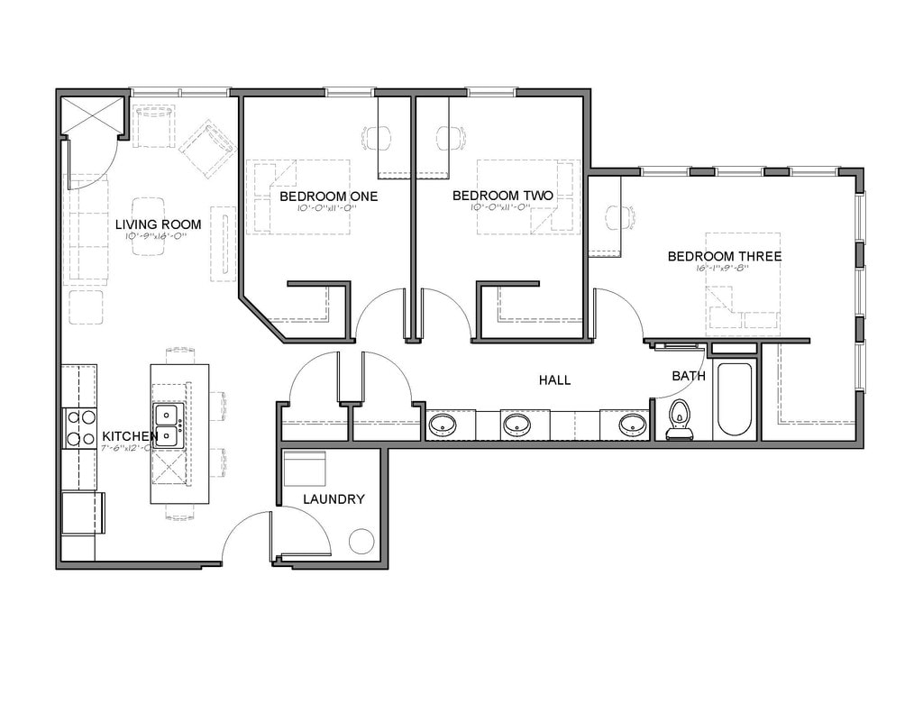 Apartment Model: 3 BR LARGER Rooms Apt 205/305$7253 Bedroom, 1 Bath, 1063-1275 sq ftAvailable June 1, 2026![]()