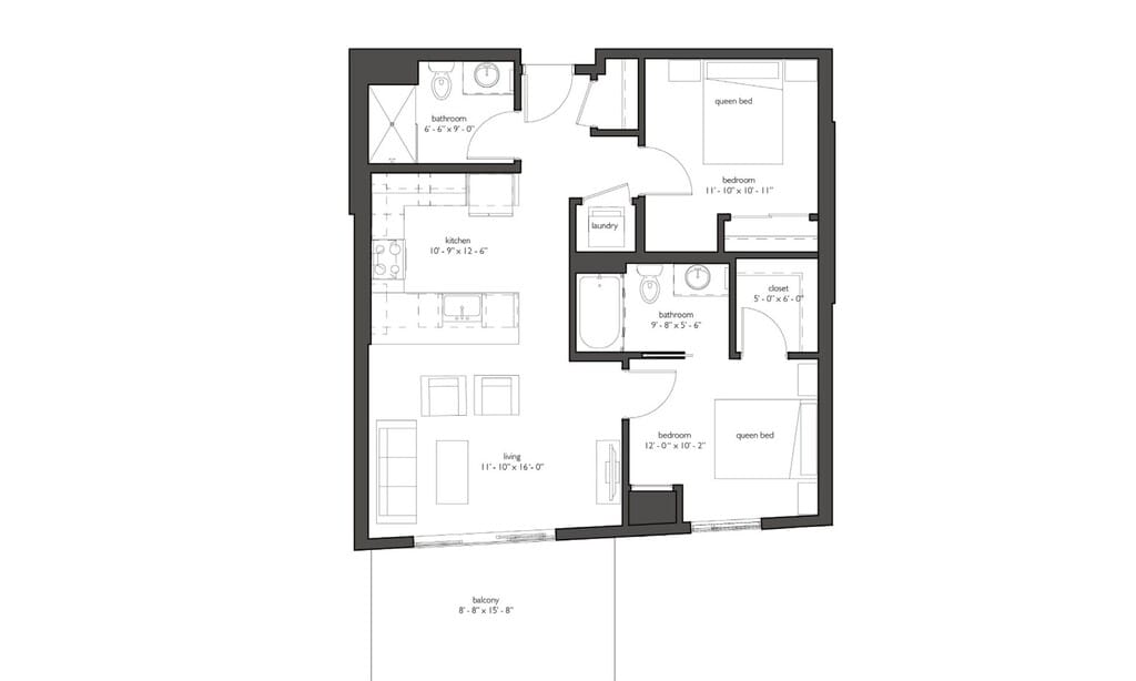 This one-bedroom residence offers 536 square feet of comfortable, efficiently arranged living in the heart of Minneapolis. The 11'2" x 15'7" living space anchors the home with an open, relaxed feel and connects directly to the private balcony — offering a true extension of the living area and a wonderful spot to enjoy the Uptown surroundings. The 14'1" x 3'3" kitchen runs along the side wall with ample cabinetry and counter space, equipped with a refrigerator and range, staying connected to the main living area without interrupting its flow. The 9'6" x 8'11" bedroom is tucked away from the living space, comfortably fitting a queen bed and offering a calm, private atmosphere for rest. The 9'6" x 6'5" bathroom is conveniently positioned nearby, and in-unit laundry is neatly integrated just steps away. A private balcony, a smart layout, and a great Uptown address — this one-bedroom residence is a solid and inviting home at The Walkway.