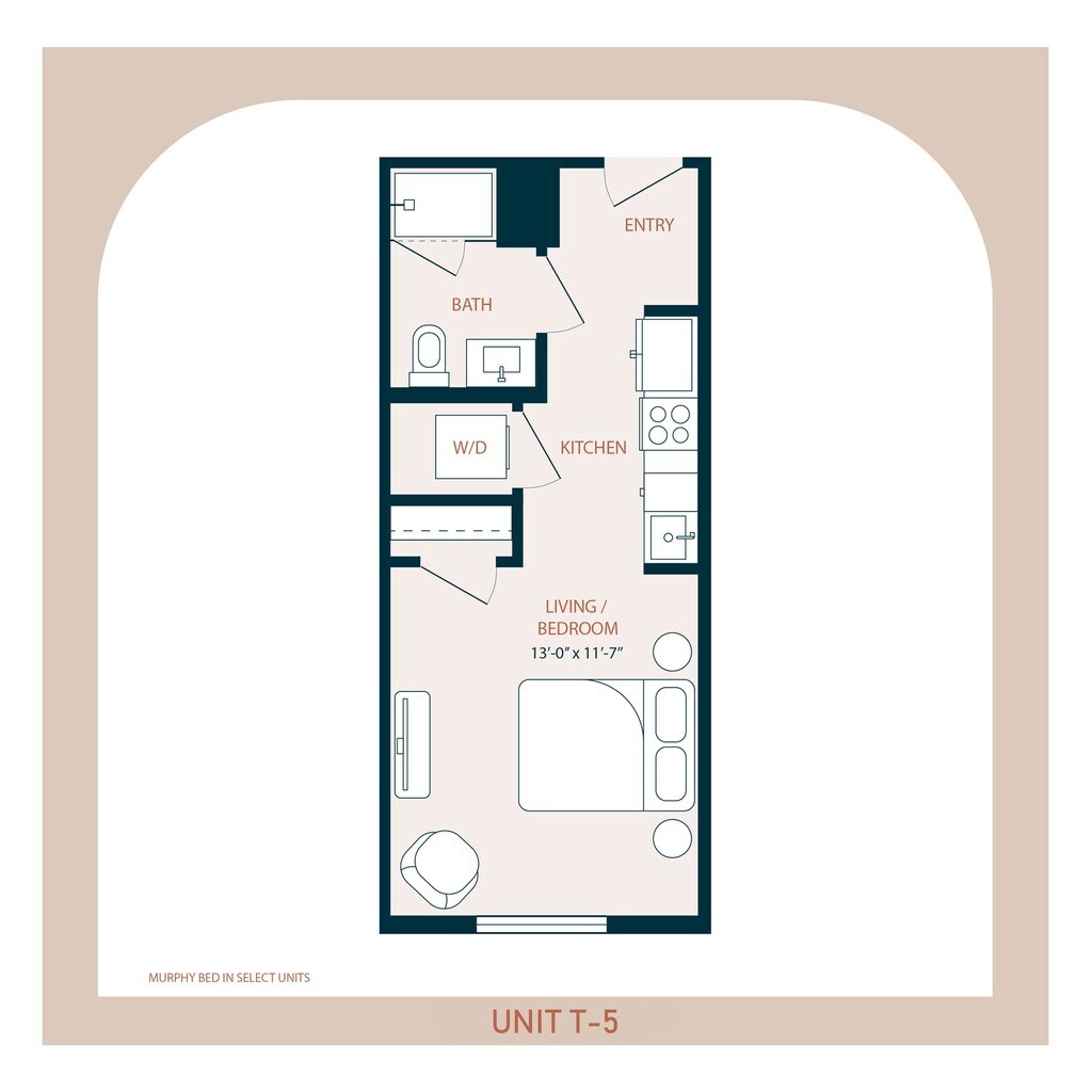 Apartment Model: T-05From $1,780Studio, 1 Bath, 369 sq ftAvailable NowFloor plans are artist's rendering. All dimensions are approximate. Actual product and specifications may vary in dimension or detail. Not all features are available in every rental home. Prices and availability are subject to change. Base rent is based on monthly frequency. Additional fees may apply, such as but not limited to package delivery, trash, water, amenities, etc. Deposits vary. Please see a representative for details.