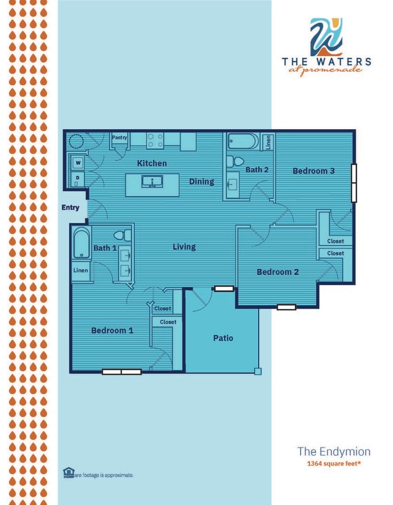 The Waters at Promenade offers 1 to 3 Bedroom apartments starting from $1,582 and having 822–1,364 sq ft. Here is the current pricing and availability: