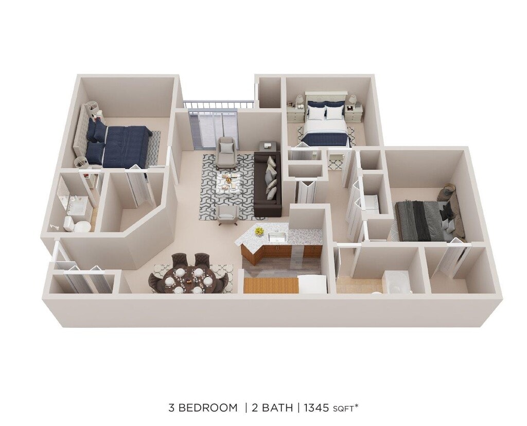 Apartment Model: Two Bedroom 2 Bath - 1,042 sqftFrom $1,4452 Bedroom, 2 Bath, 1042 sq ftAvailable Now![]()