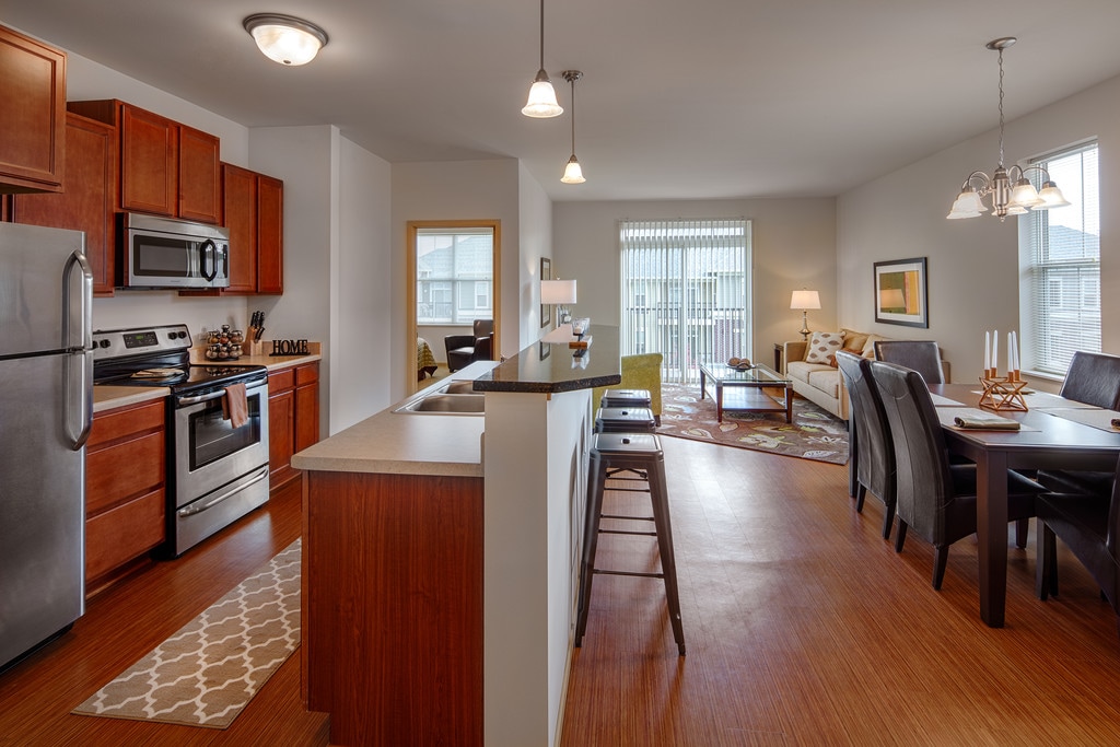Each apartment comes with beautiful design finishes and the style you'd expect from a Steve Brown Apartments community. They come with in-unit laundry, wood laminate flooring, maple cabinets, granite breakfast bars (in building 154 only), stainless appliances (including a range-hood microwave and a dishwasher), and walk in closets. Storage and heated garage parking are also available to rent.