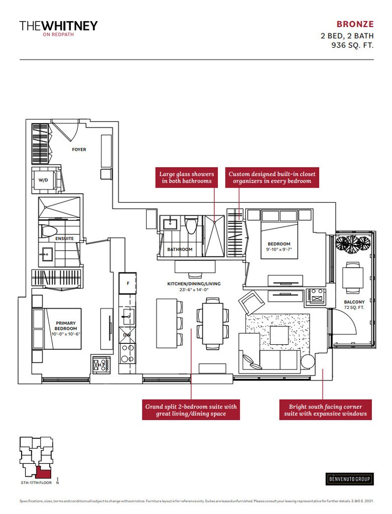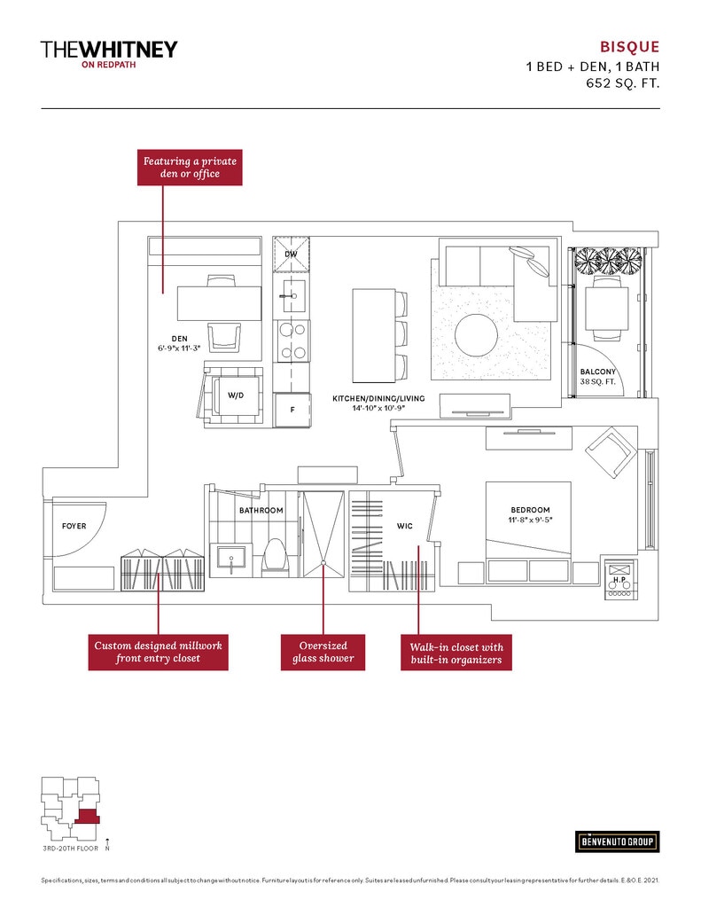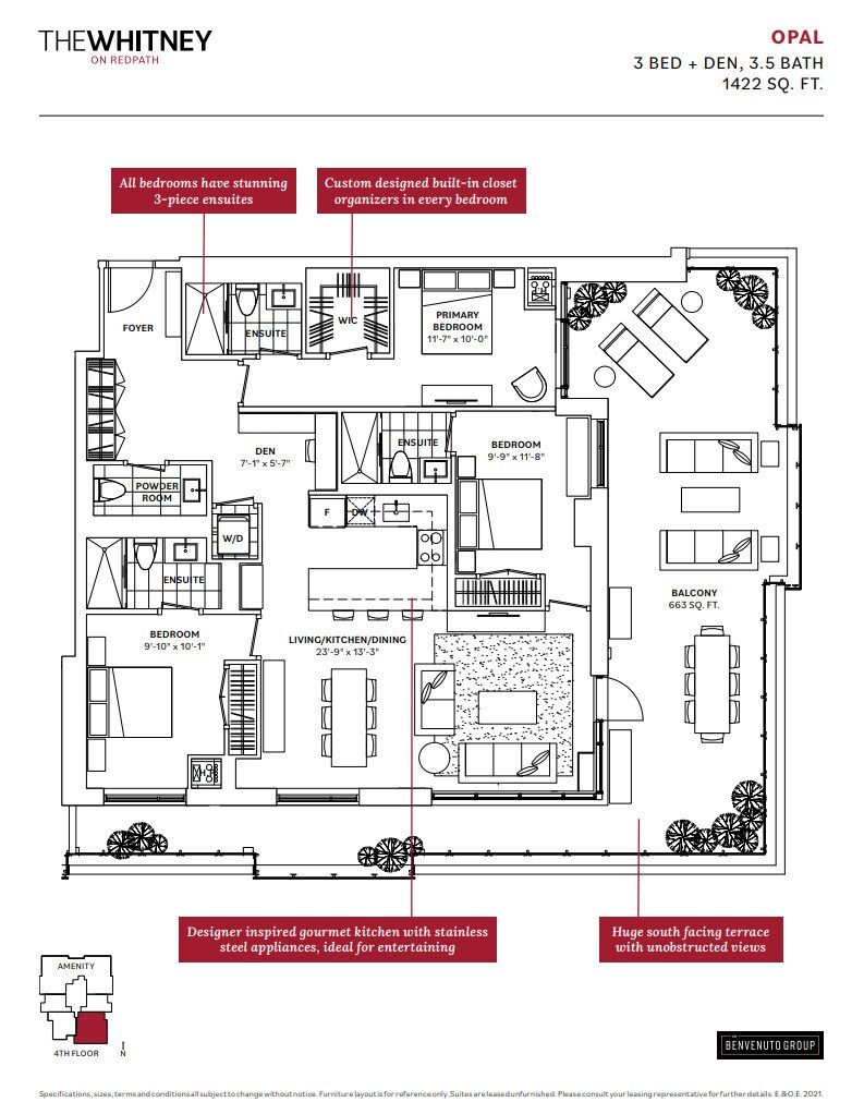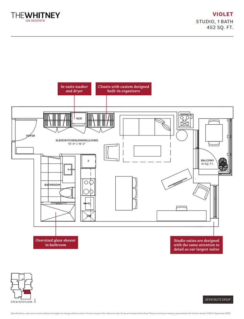 The Whitney on Redpath offers Studio to 3 Bedroom apartments starting from $1,995 and having 325–1,592 sq ft. Here is the current pricing and availability: