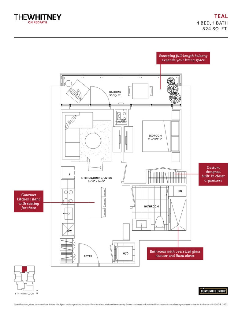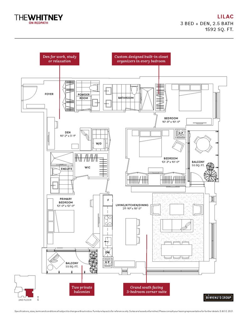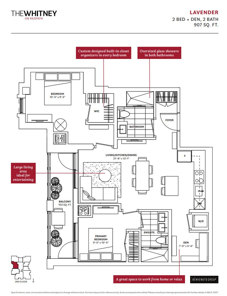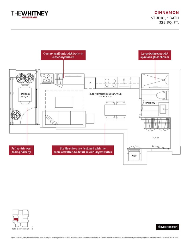 The Whitney on Redpath offers Studio to 3 Bedroom apartments starting from $1,995 and having 325–1,592 sq ft. Here is the current pricing and availability:
