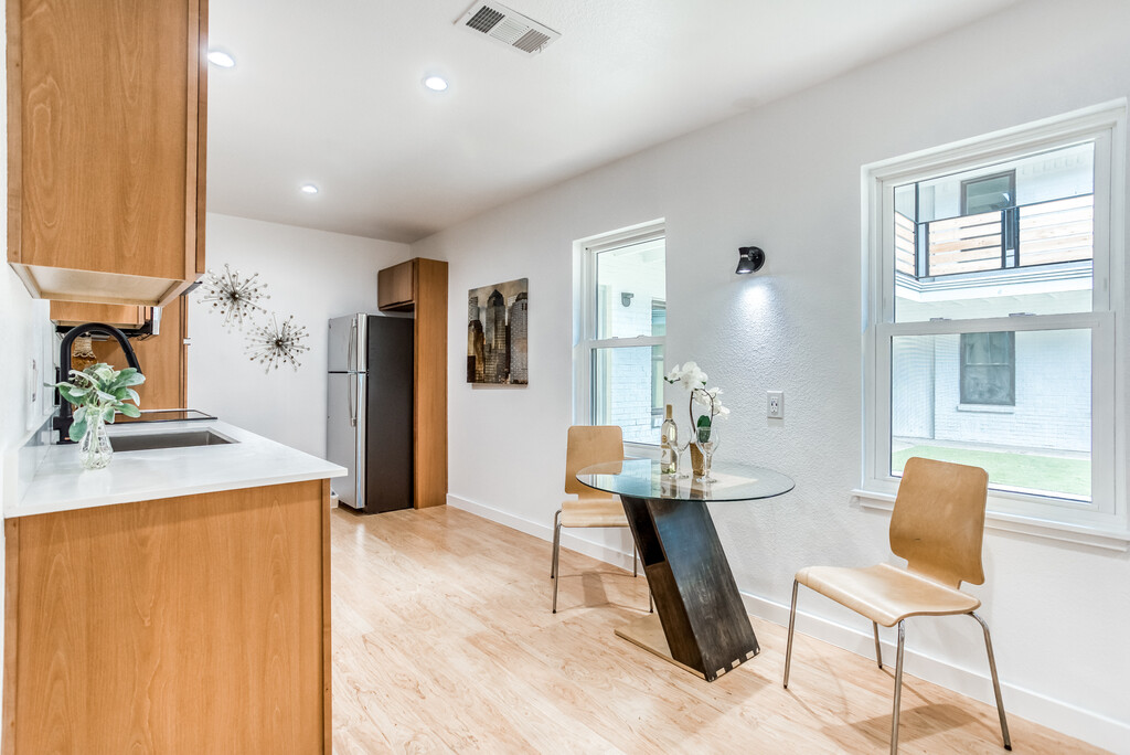 Welcome to “The Wilshire.” Old East Dallas’ new hip and luxe boutique apartment community. Steps away from the revamped Bryan Street Retail, The Wilshire has been stripped to the core and revitalized with all brand-new systems and designer finishes. The property features very spacious one and two bedroom floor plans that open to a lush middle courtyard. All first-floor units come with large fenced in outdoor patios, perfect for pets or outdoor relaxation. All second-floor units have vaulted ceilings creating more vertical space that feels more like a house than an apartment. All units have in unit laundry provided. Brand new interiors have received a best in class renovation. Units feature light faux hardwood flooring with spacious kitchens. The new warm, euro cabinets, quartz countertops, suite of stainless-steel appliances, multi point recess lighting, and undermount sinks with black gooseneck faucets are just some of the improvements made. Bathrooms are highlighted with double sink vanities with LED vanity mirrors, penny tile flooring, and soaking tub showers with designer tile. Sitting on almost an acre and a half, The Wilshire exterior has been fenced and gated for added security. The property is sprinklered with fresh sod planted. The Wilshire is walking distance to Jimmy’s, Mai’s, Café Urbano, and Top Round. The property is also in close proximity to Lower Greenville, Knox Henderson, Uptown, and downtown.