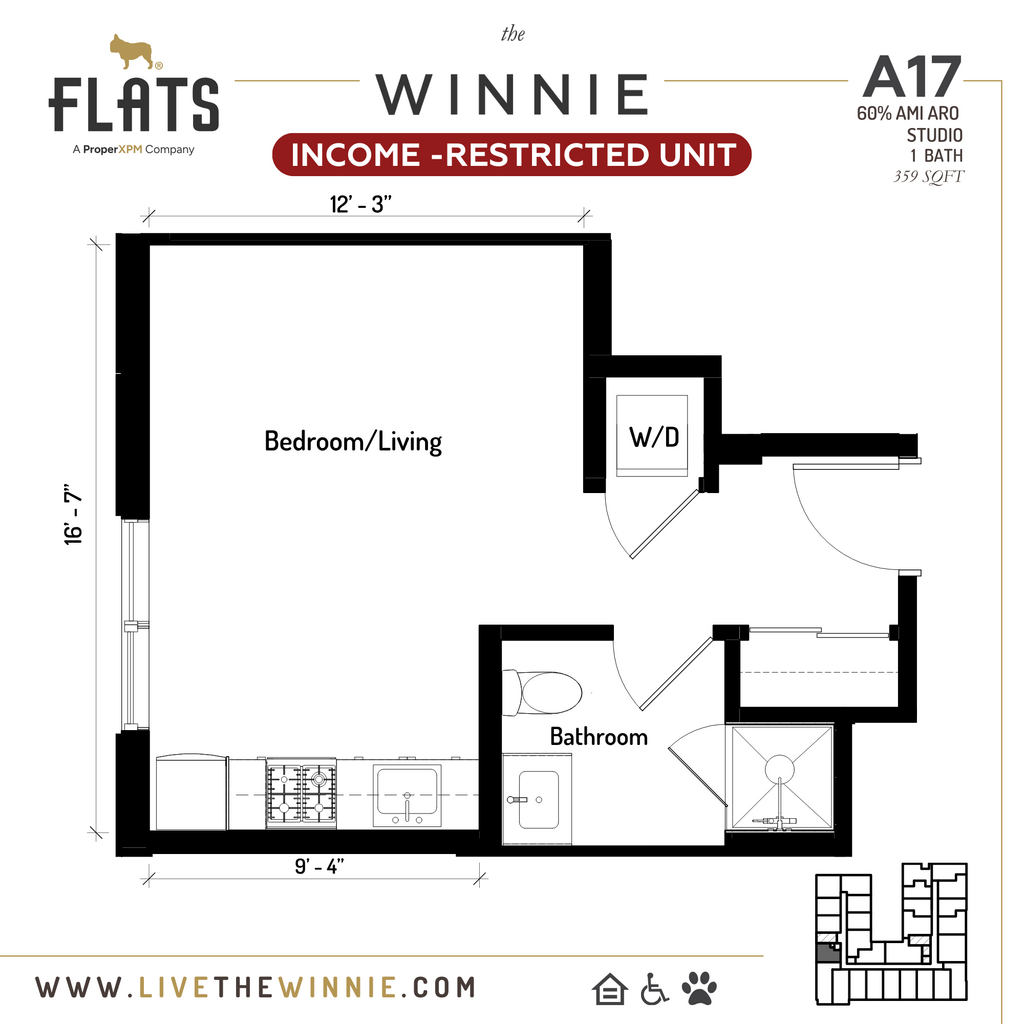 The Winnie offers Studio apartments starting from $1,227 and having 359 sq ft. Here is the current pricing and availability: