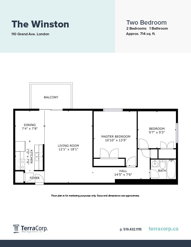 2 Bedroom - Floorplan 1 Apartment Unit: 409Apartment Model: 2 Bedroom2 Bedroom, 1 Bath, 714 sq ftAvailable Now
