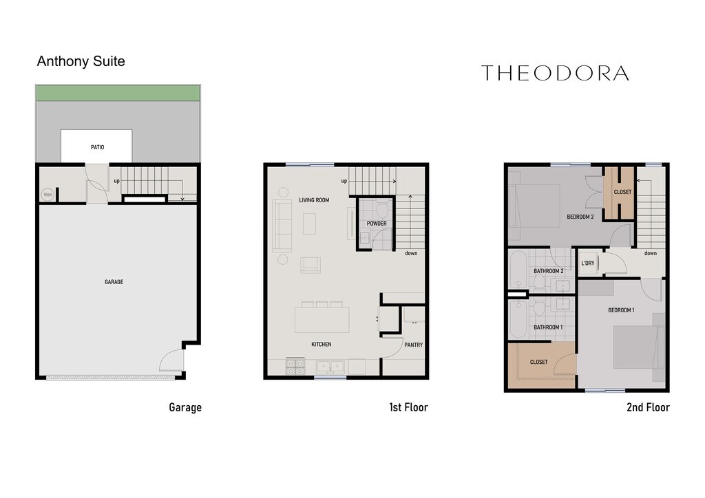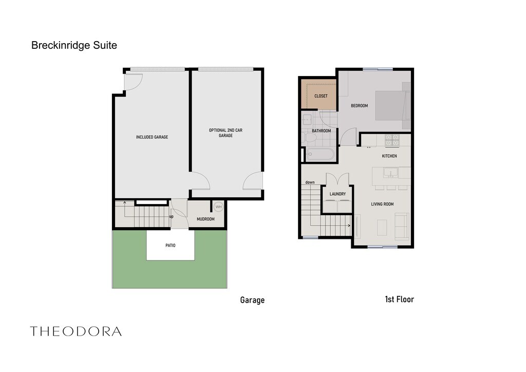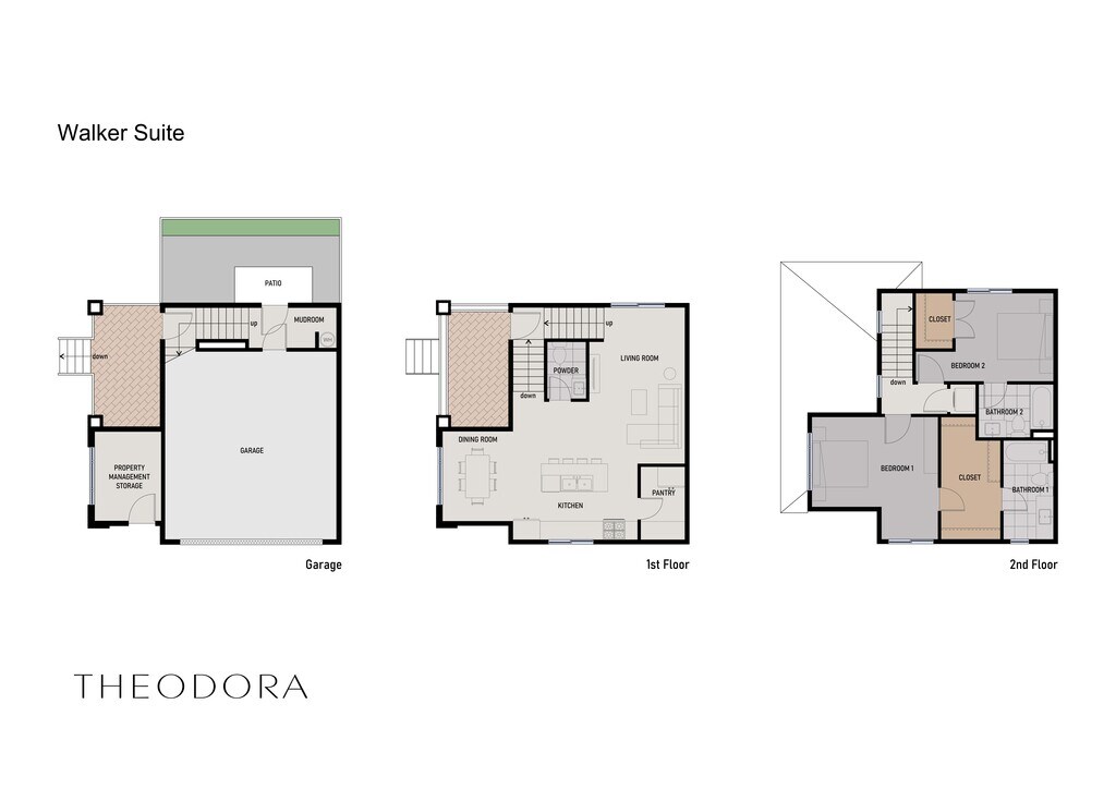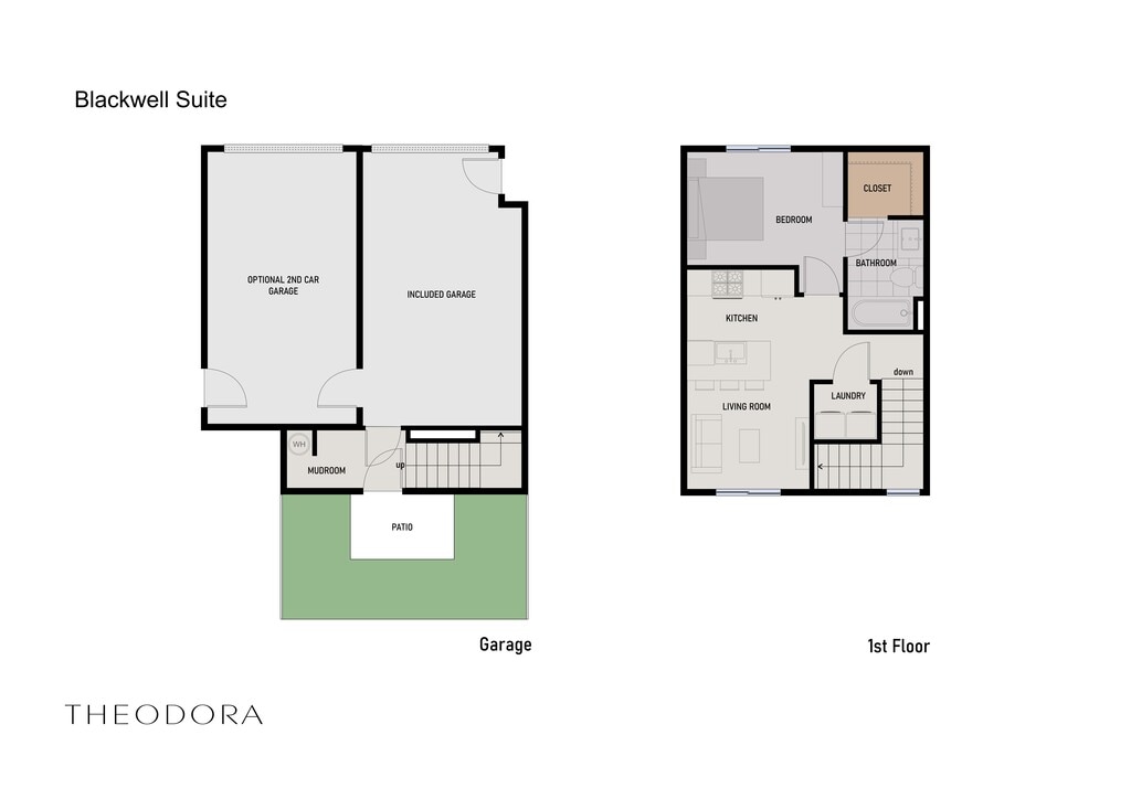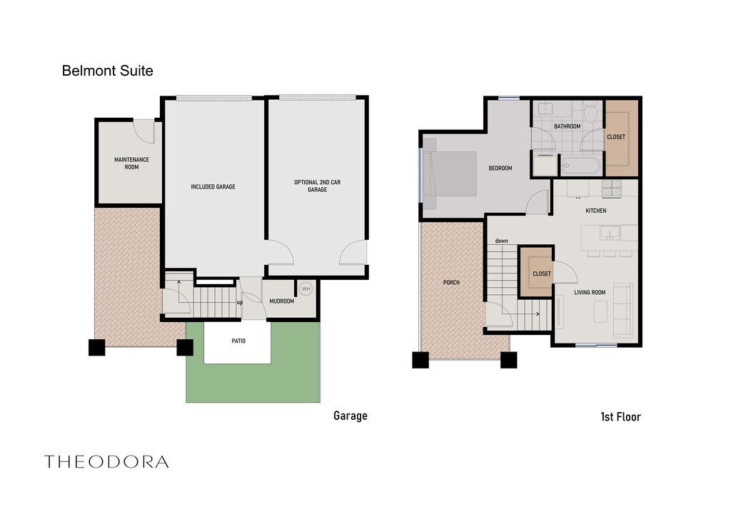 - The Theodora - Your own private garage, your own green space and front door. All units are side-by-side with no one living above or below you and shared walls are extra-insulated against sound. No shared hallways or elevators and your packages are delivered to your door, not a communal mailroom. Set your own garbage container right outside your garage for weekly pickup. Your food delivery drivers can drive right up to your door and ring your doorbell. Windows on north and south walls for great natural light and ventilation. Interiors include luxury vinyl flooring, modern kitchens with quartz countertops and stainless steel appliances, unique recessed strip light in ceiling and upscale fixtures in thoughtfully designed floor plans. No more 5am trips down an elevator to let your dog out, just let them out in your private backyard. Two car garage included with 2 bedroom, one car garage included with one bedroom. Garages pre-wired for 240 volt car charging capability.