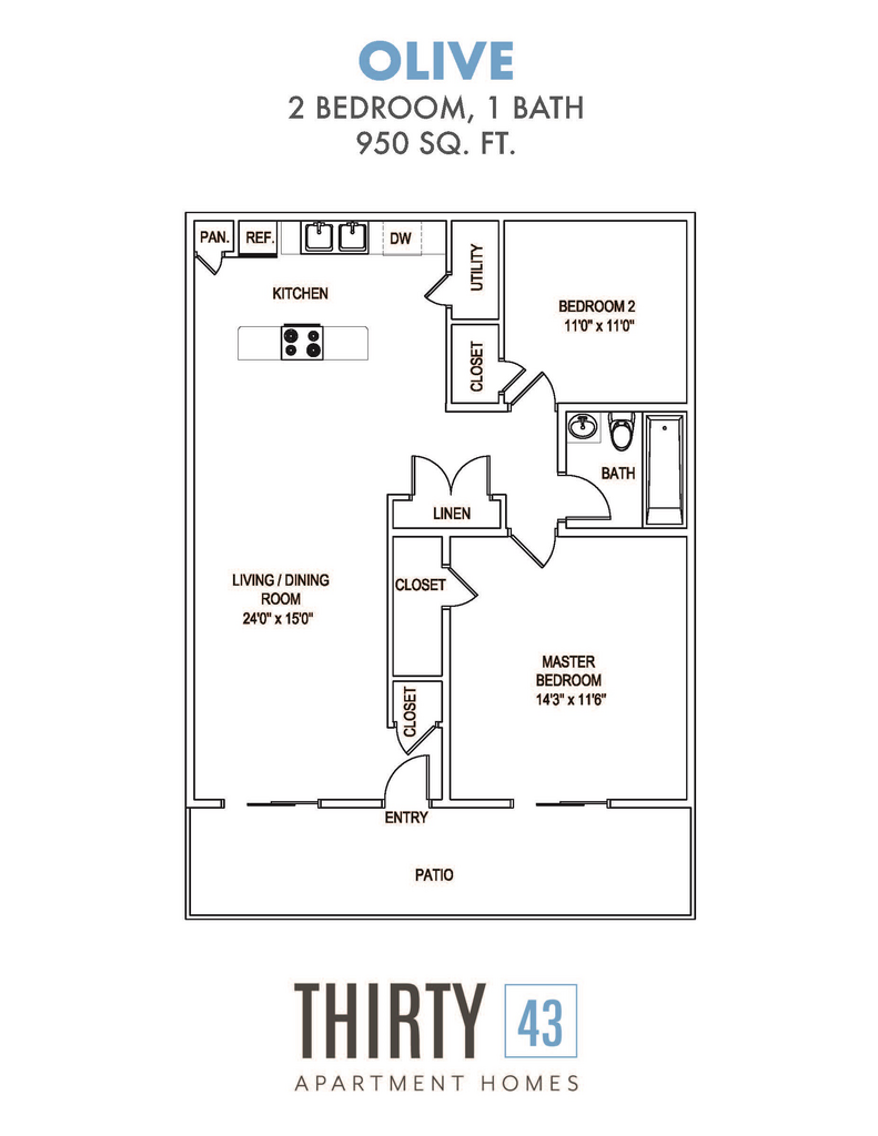 Apartment Model: OliveCall For Rates2 Bedroom, 1 Bath, 950 sq ftUnavailableFloorplansPhotos![]()