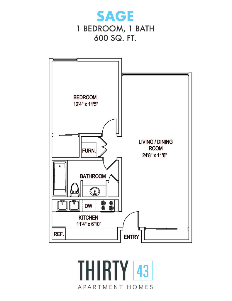 Apartment Model: Sage$1,2631 Bedroom, 1 Bath, 600 sq ftAvailable NowFloorplansPhotos![]()
