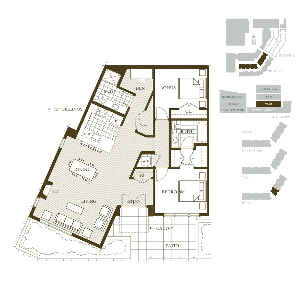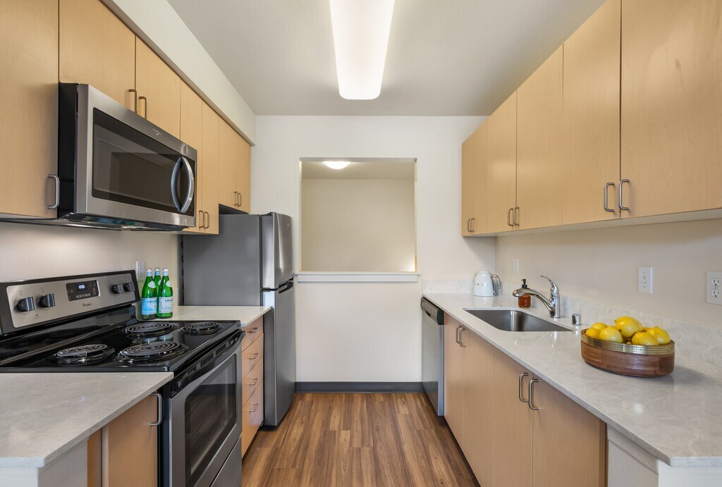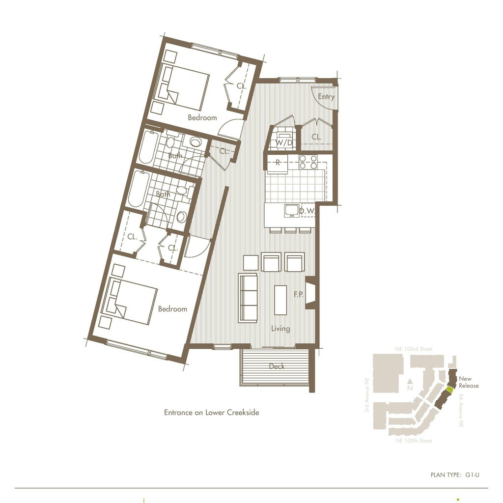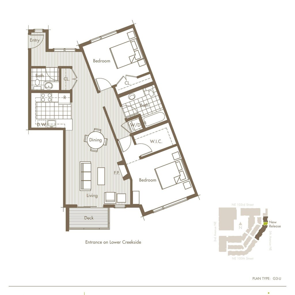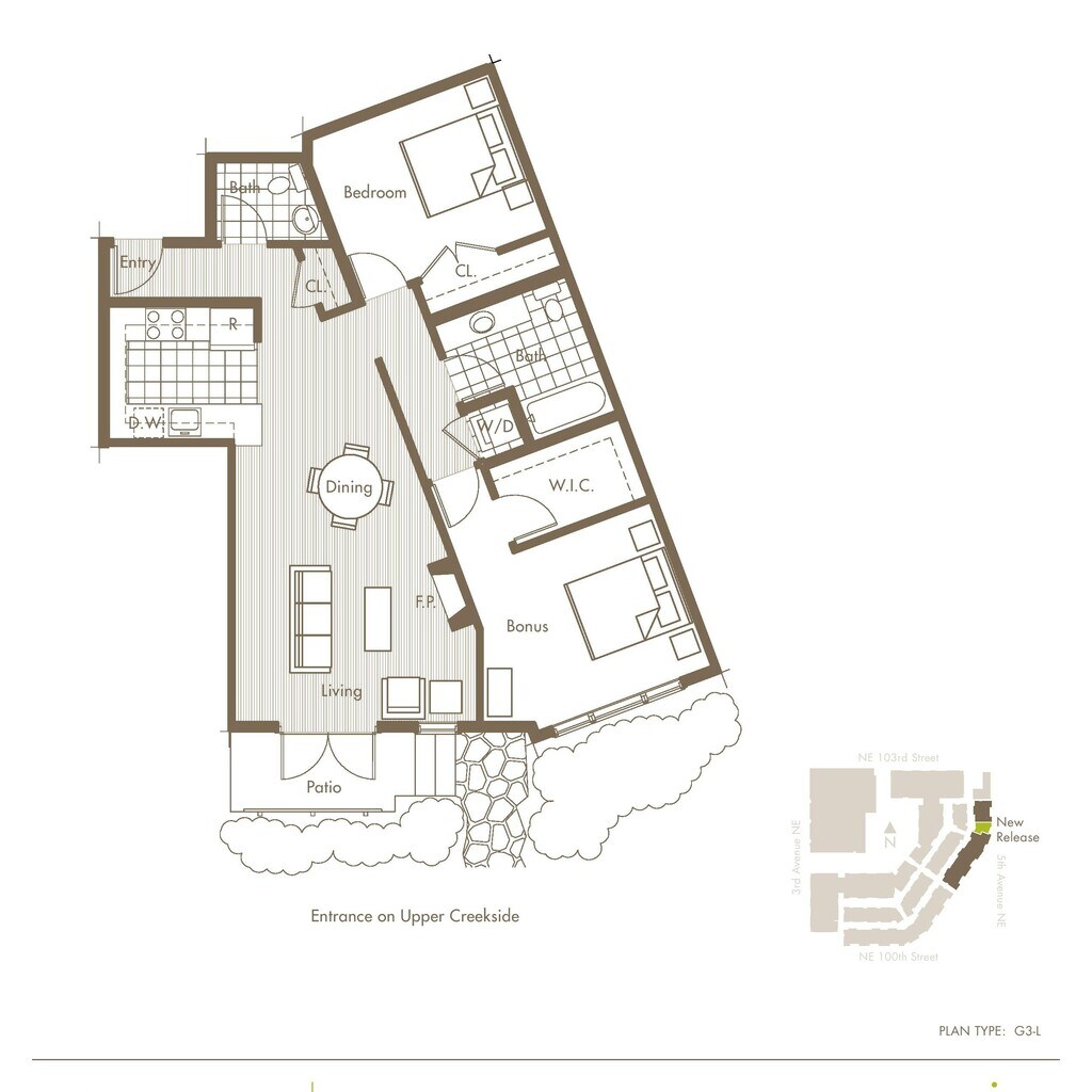 Thornton Place offers two styles of apartments: Creekside and Plaza. Creekside features refined interiors including natural gas fireplaces and ranges, private patio or balcony spaces, a stainless-steel kitchen package, and granite countertops. Our Plaza apartments features blonde wood cabinetry, trash chutes on every floor, and energy-efficient appliances. Each apartment has abundant natural light, open floor plans, and unique views of our community. Thornton Place is also home to a 14-screen Regal Cinemas theater, seven restaurants, and is only a quick 5-minute walk to the Northgate Light Rail station.