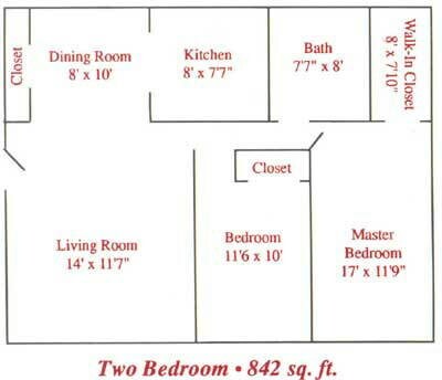 - 2 Bedrooms- Two Bedroom- $8952 Beds, 1 Bath, 842 sq ftAvailable Now- Model Gallery- Floorplans- Availability Details- Price - Availability Date - Unit - Sq Ft - $895 - Available Now - Two Bedroom - 842 sq ft - Model Amenities and Features- Features- Air Conditioning