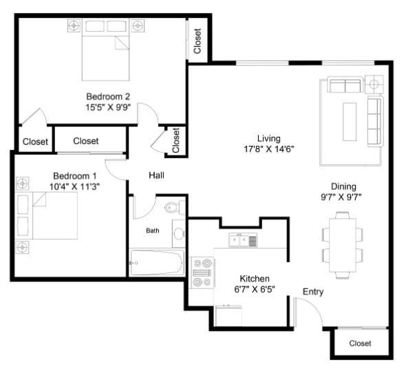 Apartment Model: 2 Bed 1 Bath$1,2452 Bedroom, 1 Bath, up to 750 sq ftAvailable Now2 Bed 1 Bath - Floorplan 1 2 Bed 1.5 Bath