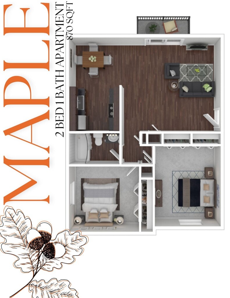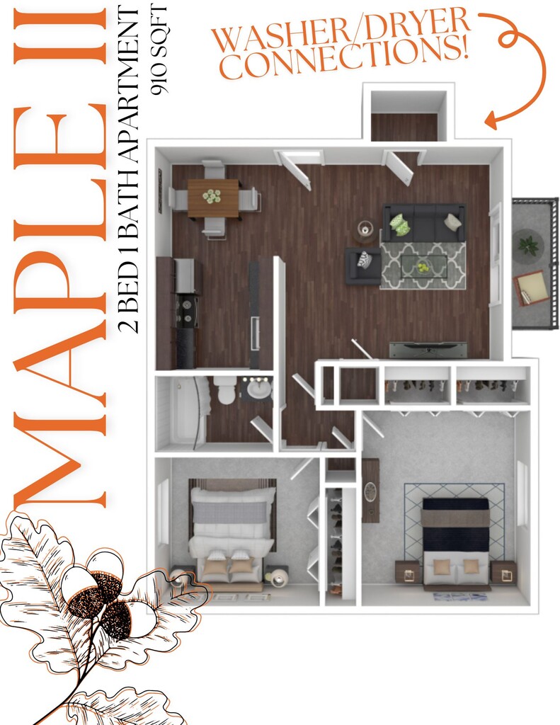 Apartment Model: MAPLE llFrom $9952 Bedroom, 1 Bath, 910 sq ftAvailable Now![]()