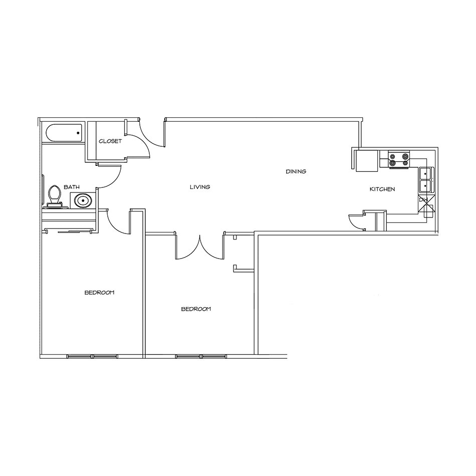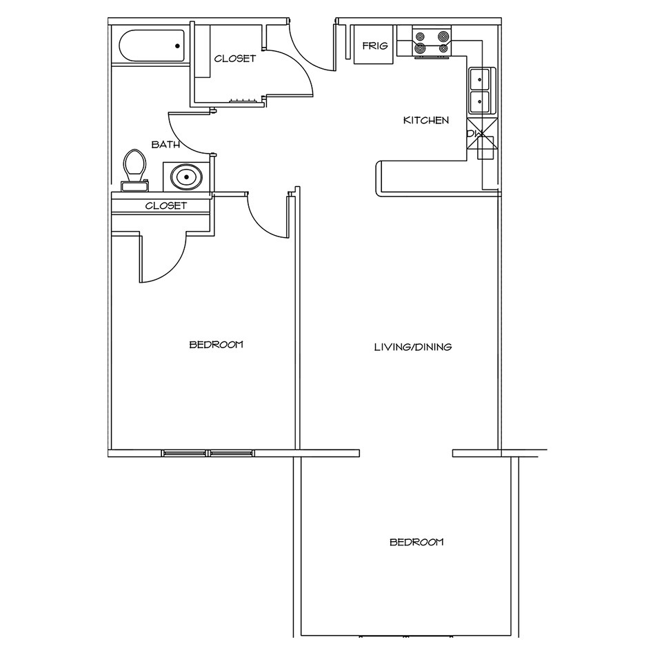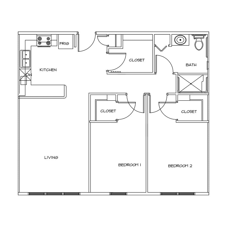 1 Bedroom, 1 Bathroom - Floorplan 2 2 Bedrooms