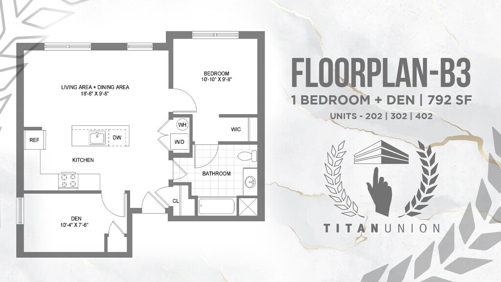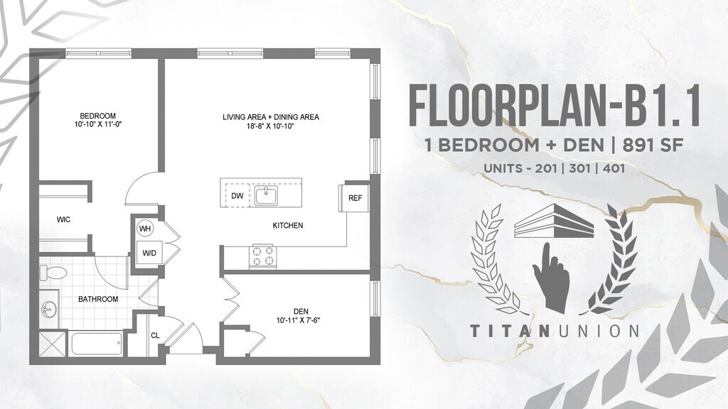 1 Bedroom + Den - Floorplan 11 Apartment Unit: 413Apartment Model: 1 Bedroom + Den1 Bedroom, 1 Bath, 1000 sq ftAvailable Now1BR/1.0BA
