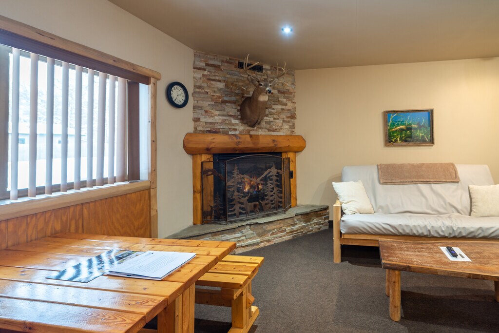 Newly remodeled log cabin themed motel in Indian River, Michigan. The log cabin themed motel exudes rustic charm with its handcrafted wooden exterior and cozy interiors. Each room features log furniture & fireplace. Each cabin is named after an animal in the wild. The motel also has a communal fire pit for evening gatherings, adding to the authentic log cabin experience.