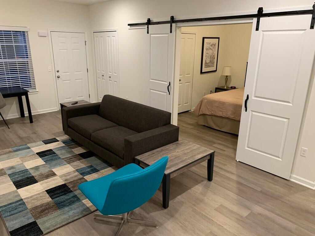 Large 1 Bedroom/1 Bathroom Apartment w ATTACHED GARAGE. 9’ Ceilings. Granite Throughout. Stainless Steel Appliances. Luxury Vinyl Plank Flooring. Barn Doors Master Bedroom. Large Snack Bar (4-5 Bar Stools). Washer/Dryer In Unit.