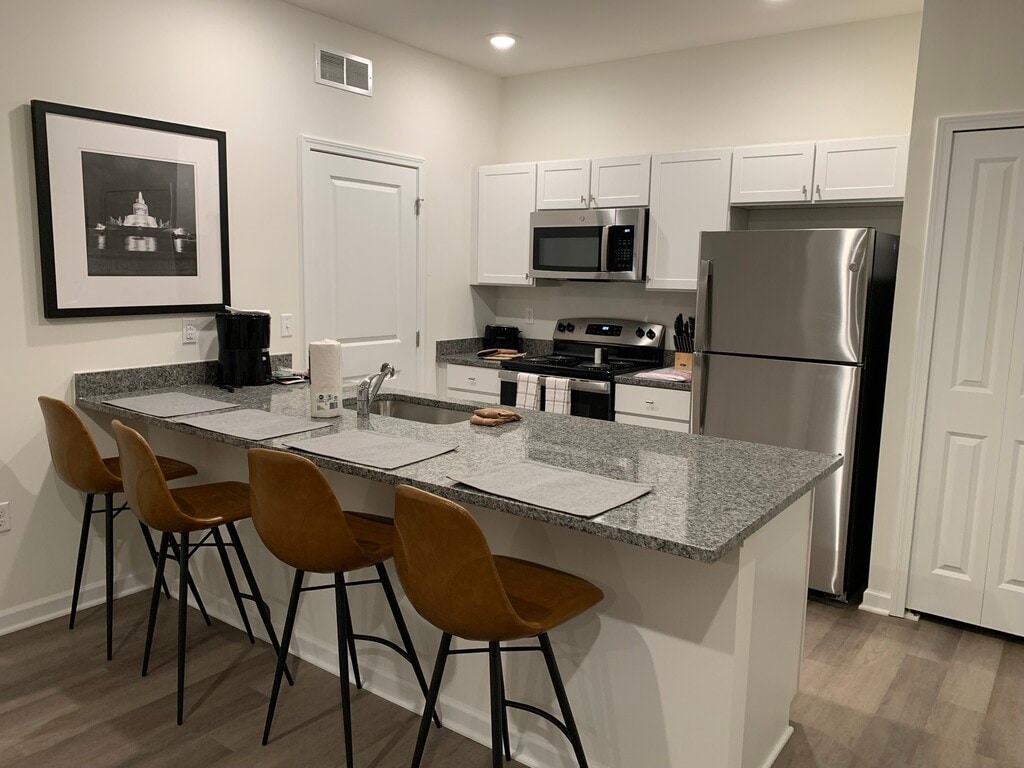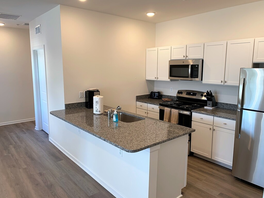 Large 1 Bedroom / 1 Bath on First Floor w Luxury Vinyl Plank Floors, 9' Ceilings, Stainless Steel Appliances, Washer/Dryer, Granite Throughout, Extra Large Snack Bar (4 Barstools).