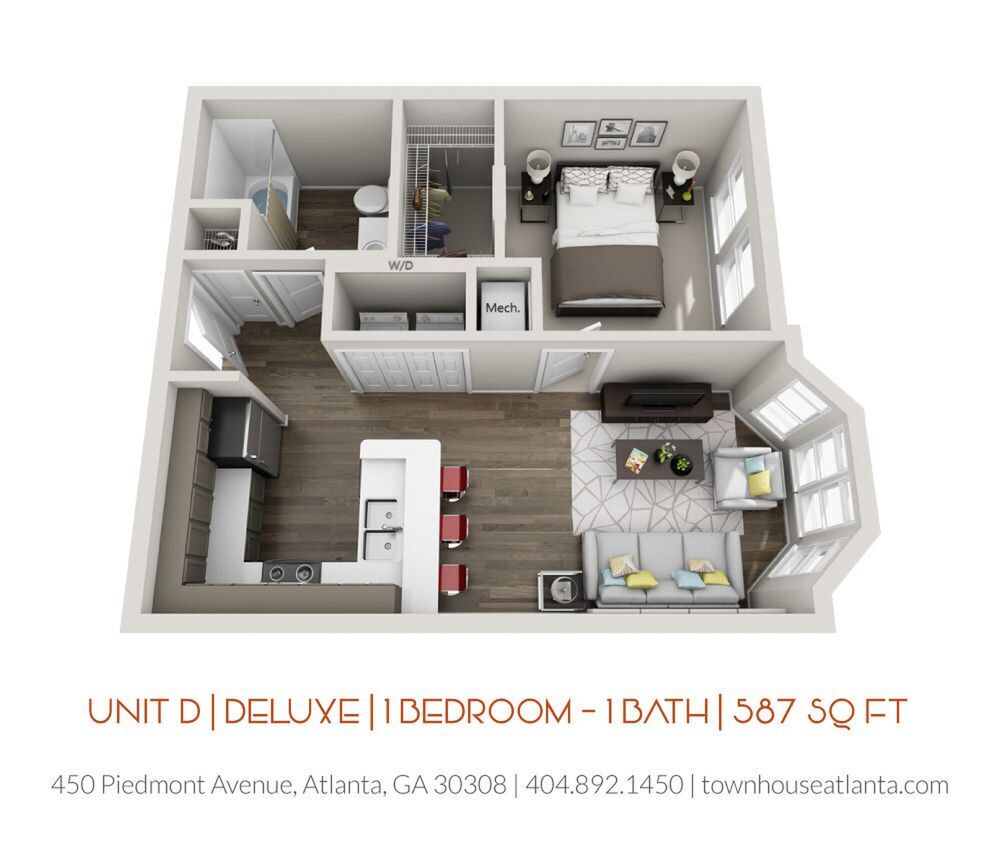 Townhouse Atlanta offers 1 to 2 Bedroom apartments starting from $1,446 and having 587–1,364 sq ft. Here is the current pricing and availability: