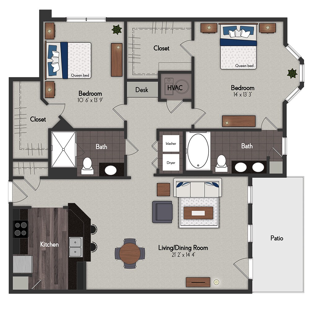 2 Beds, 2 Baths, 1605 sq ftAvailable NowLargest 2 BedroomThis is the largest 2 Bedroom at this PropertyModel Gallery