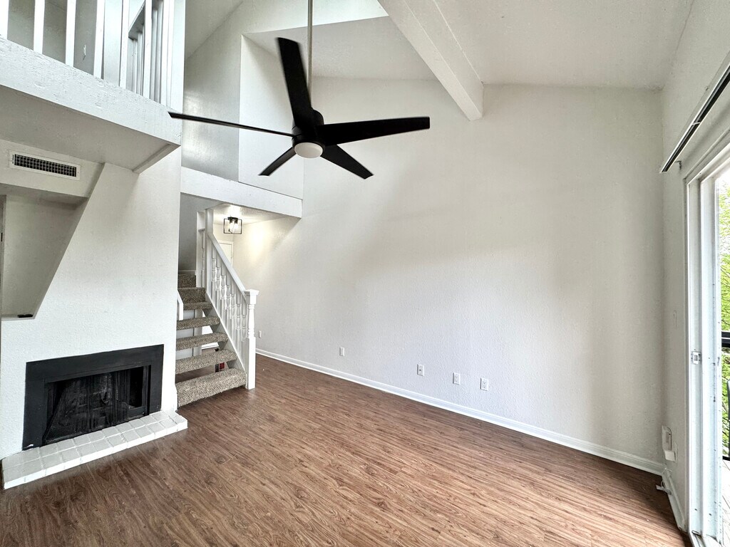 1st floor, Nice Balcony with views, plank flooring, black appliances, white cabinets