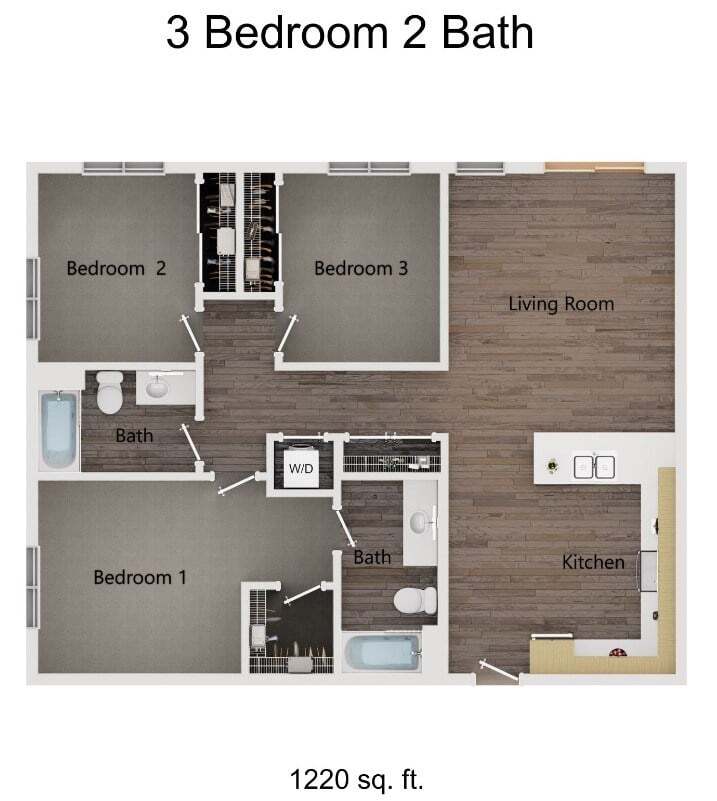 Apartment Model: 3 Bedroom 2 BathCall For Rates3 Bedroom, 2 Bath, 1220 sq ftUnavailable3 Bedroom 2 Bath - Floorplan 1 3 Bedroom 2 Bath S