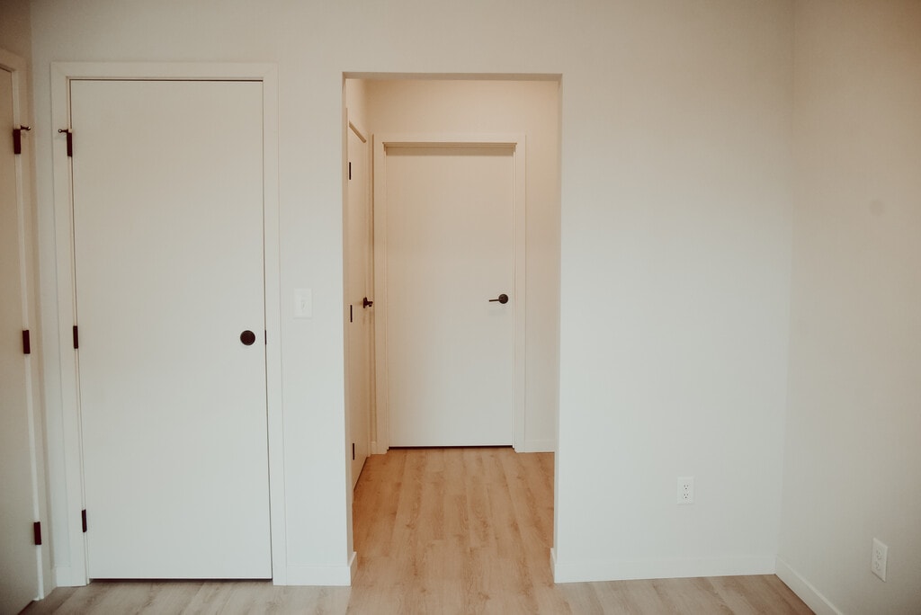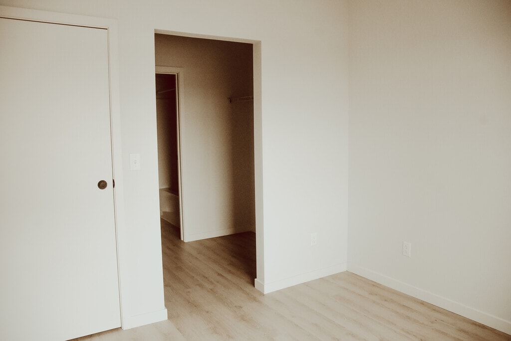A large one-bedroom apartment at Trestle Lofts featuring an open layout, modern finishes, and a private courtyard-facing balcony. The unit includes quartz countertops, in-unit washer and dryer, and a spacious bedroom with ample closet space—located in the heart of downtown Bismarck.