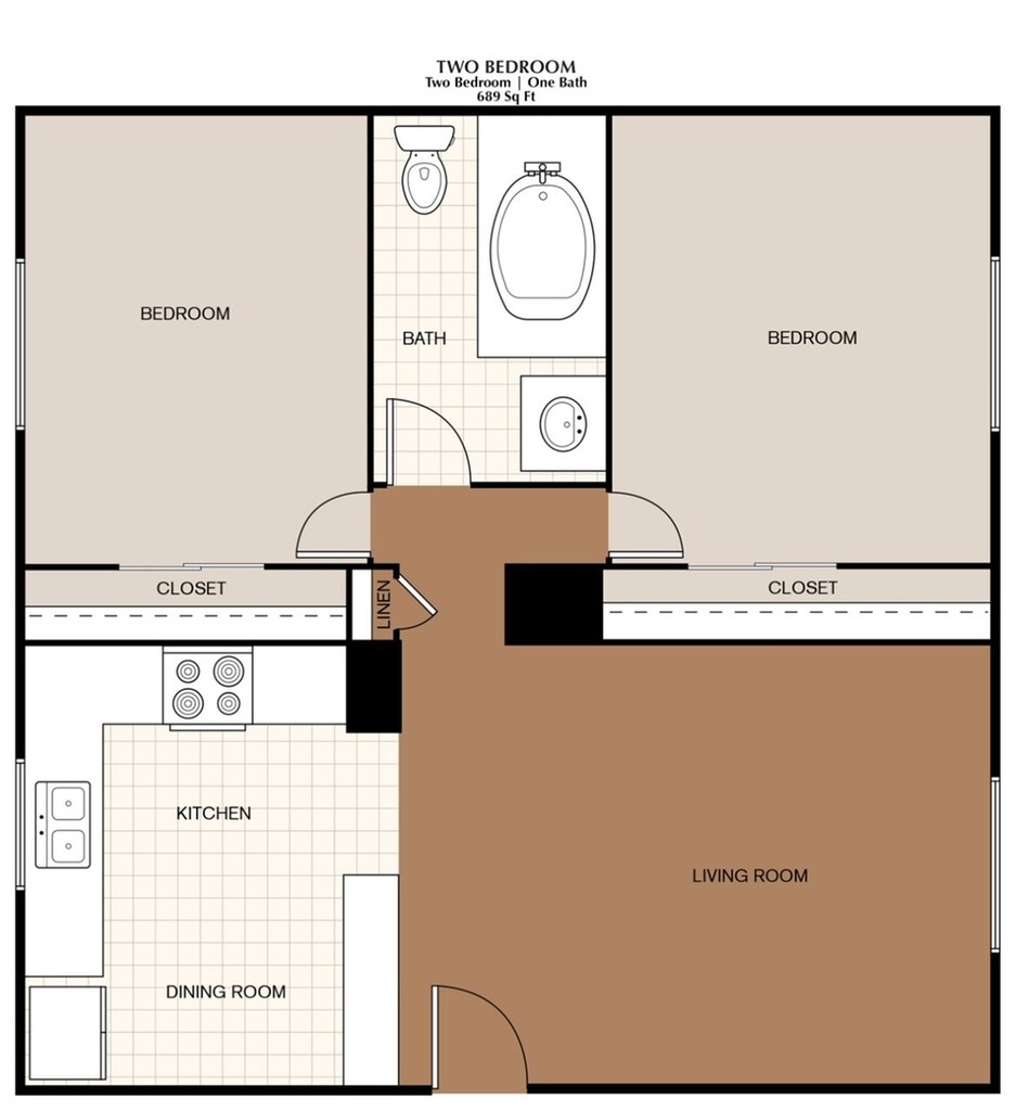 2 Beds, 1 Bath, 689 sq ftAvailable NowModel Gallery